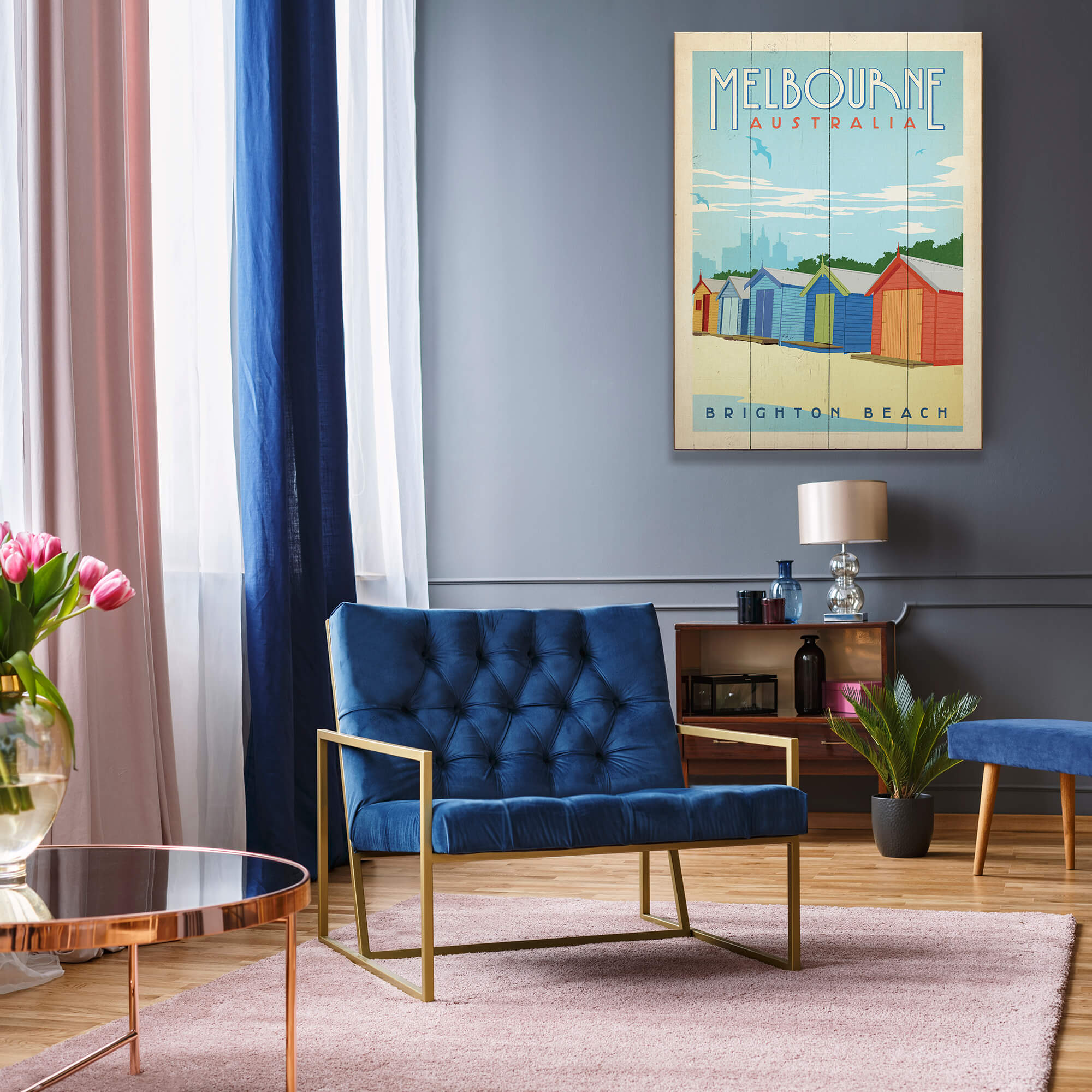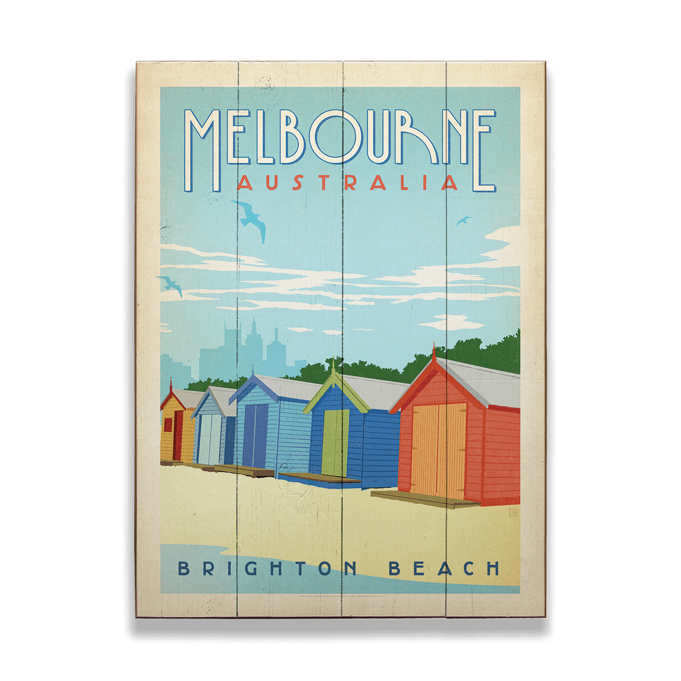 Celebrate Melbourne's coastal charm with this retro-style print, featuring the iconic Brighton Beach bathing boxes. With its bold lettering and vibrant depiction of the colorful beach huts set against a serene sky, this artwork captures the whimsical and historic spirit of one of Australia’s most picturesque beaches. The muted tones and vintage design pay tribute to Melbourne's cultural tapestry, making it a stylish addition to any space.