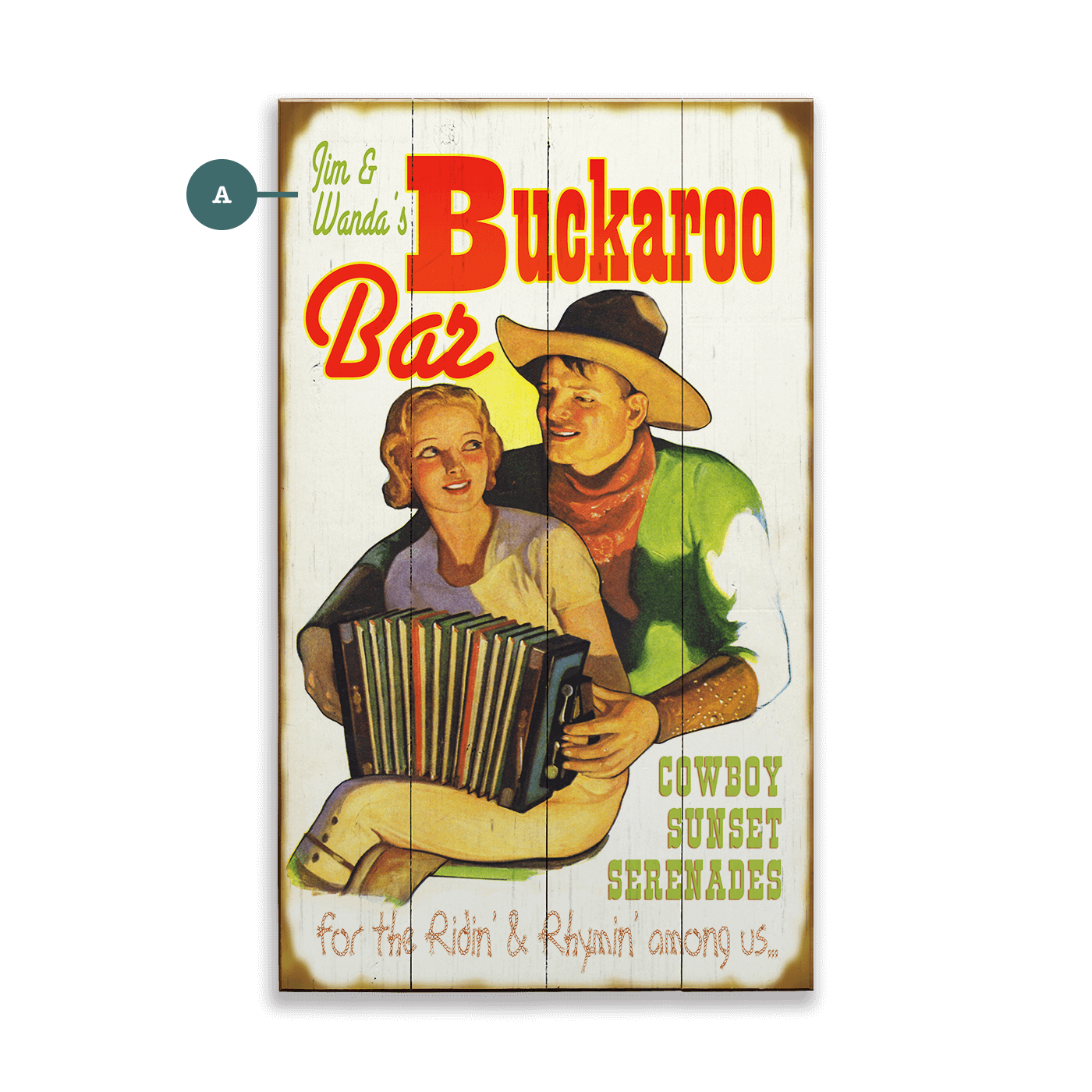 Celebrate the lively spirit of the the music, camaraderie, and cowboy culture of the Old West. Featuring a rugged cowboy teaching a smiling girl to play the accordion, it captures the charm of western saloons and frontier gatherings. The bold, nostalgic typography and warm color palette enhance its rustic appeal, making it a perfect piece for bars, saloons, ranch homes, and spaces that embrace country living. Whether you love western music, cowboy poetry, or the romance of sunset serenades, this artwork brings a welcoming and musical touch to any setting.