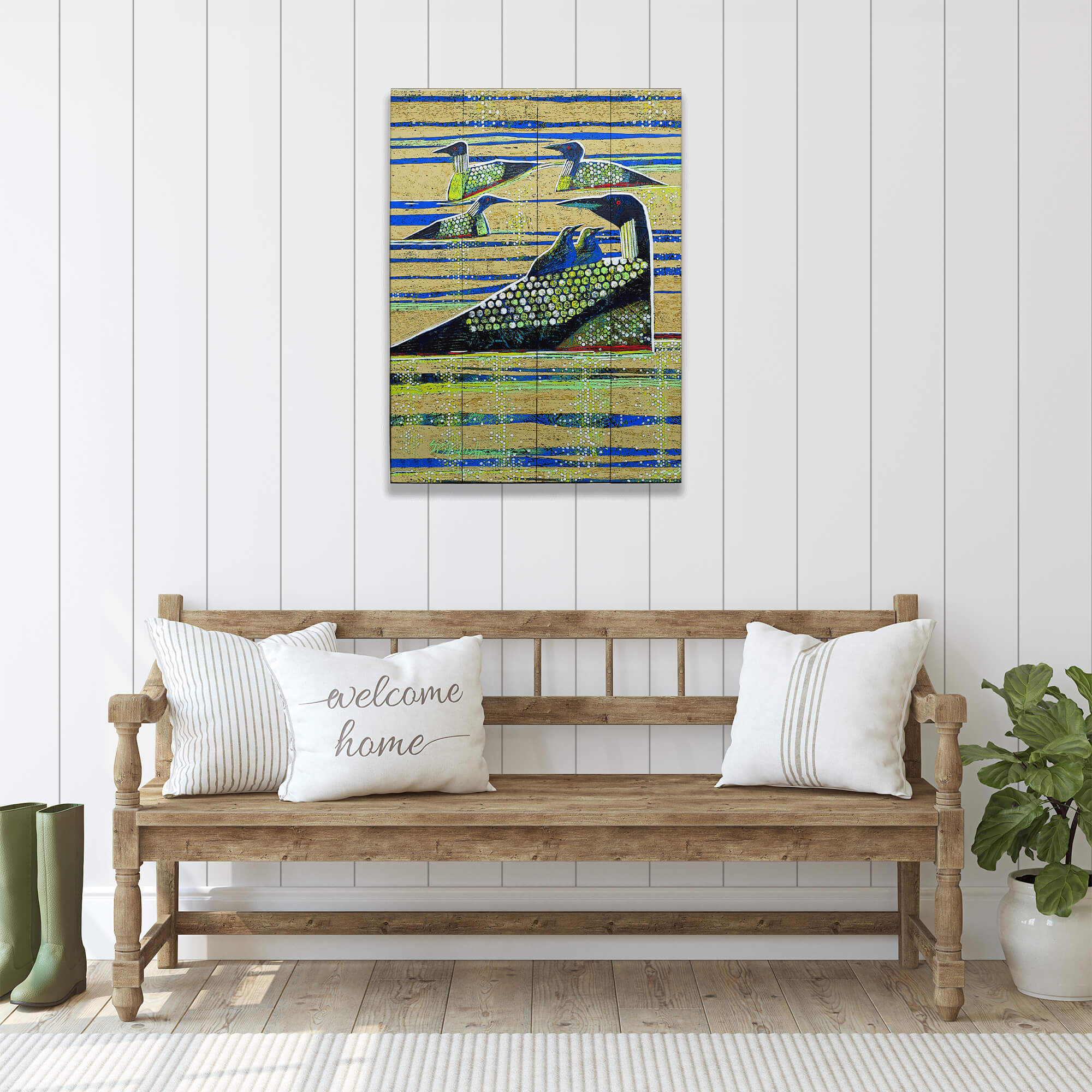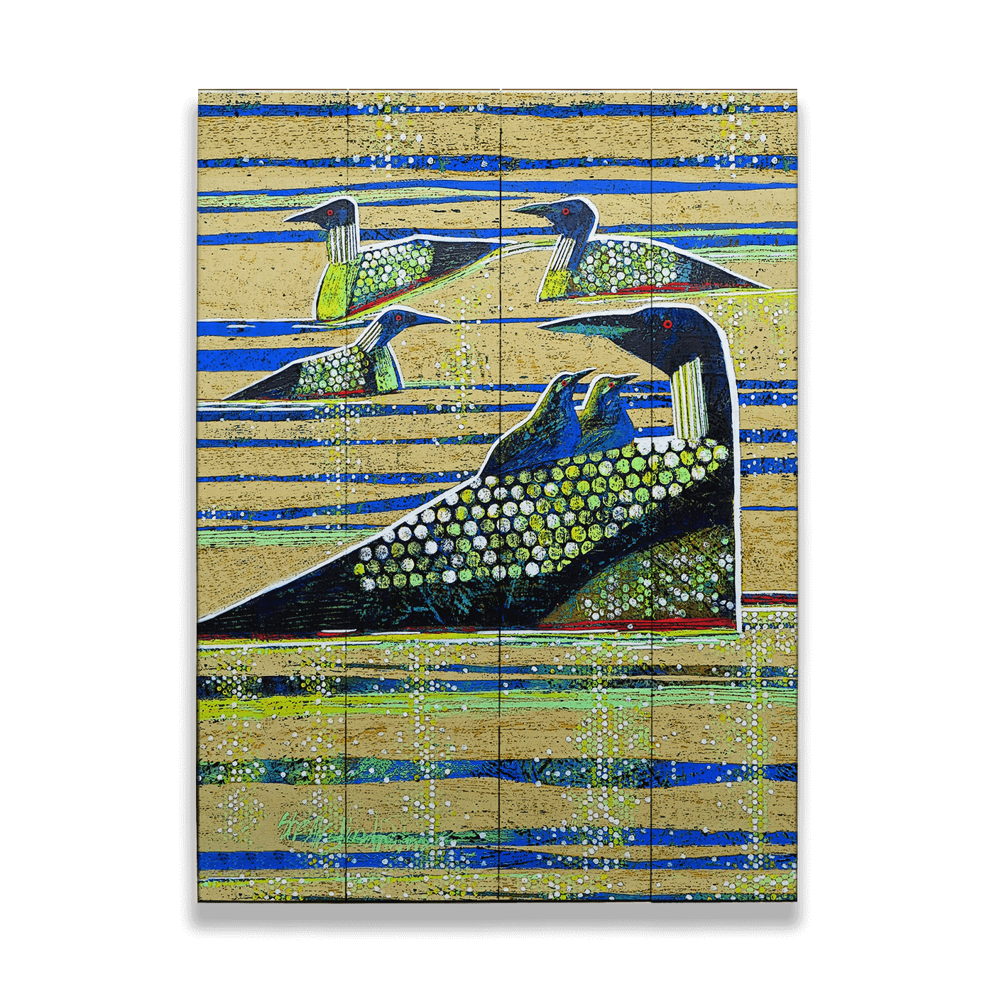 Celebrate the essence of wildlife with this masterful creation that blends detail and bold design. Featuring a flock of stylized loons adorned with intricate patterns and dotted textures, this piece radiates harmony and nature-inspired elegance. The dynamic interplay of earthy tones and bold blues evokes a sense of tranquility and movement, perfect for bird lovers or anyone looking to enhance their space with artistic depth.