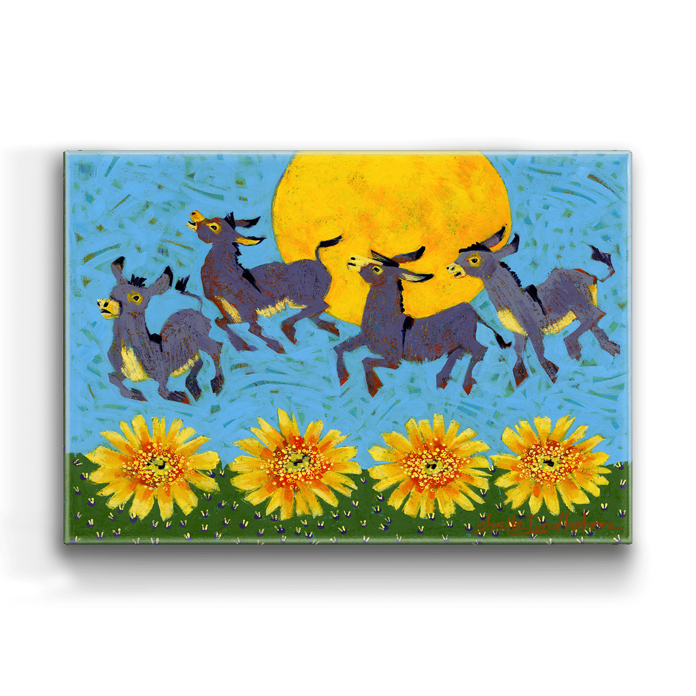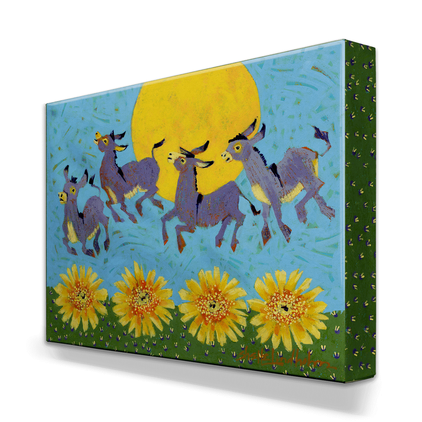 This vibrant and whimsical artwork showcases a playful group of donkeys prancing beneath a bright sun, set against a backdrop of bold cactus flowers. The colorful palette and dynamic composition capture a sense of joy and movement, making this piece perfect for those looking to add a lively, cheerful vibe to their space. Ideal for lovers of Southwestern art and nature-inspired themes, this artwork brings a touch of fun and warmth to any room.