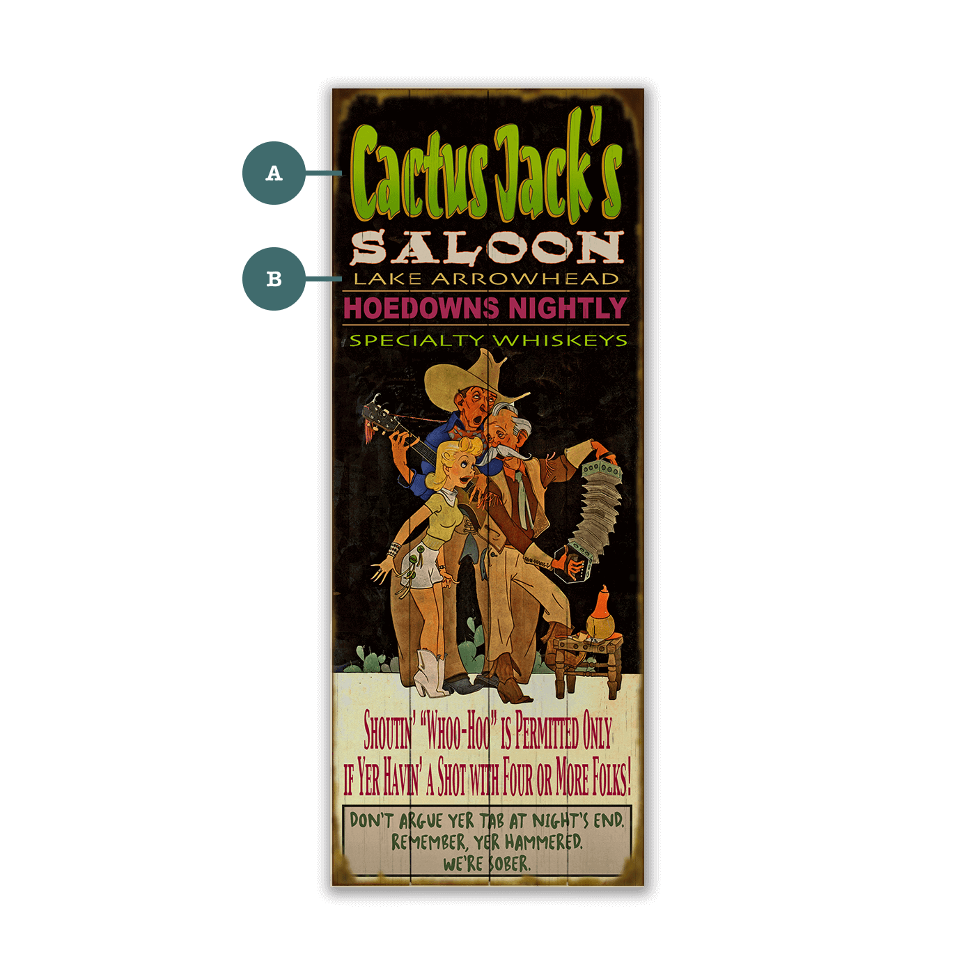 Capturing the lively energy of a rowdy Western saloon, this artwork brings to life the spirit of late-night hoedowns, specialty whiskeys, and good-natured revelry. With a humorous touch, it sets the tone for an establishment where the drinks flow freely, laughter fills the air, and the only rule is to enjoy the night. Whether a nod to classic saloons of the past or a playful decoration for a modern space, this piece is full of character and cowboy charm.