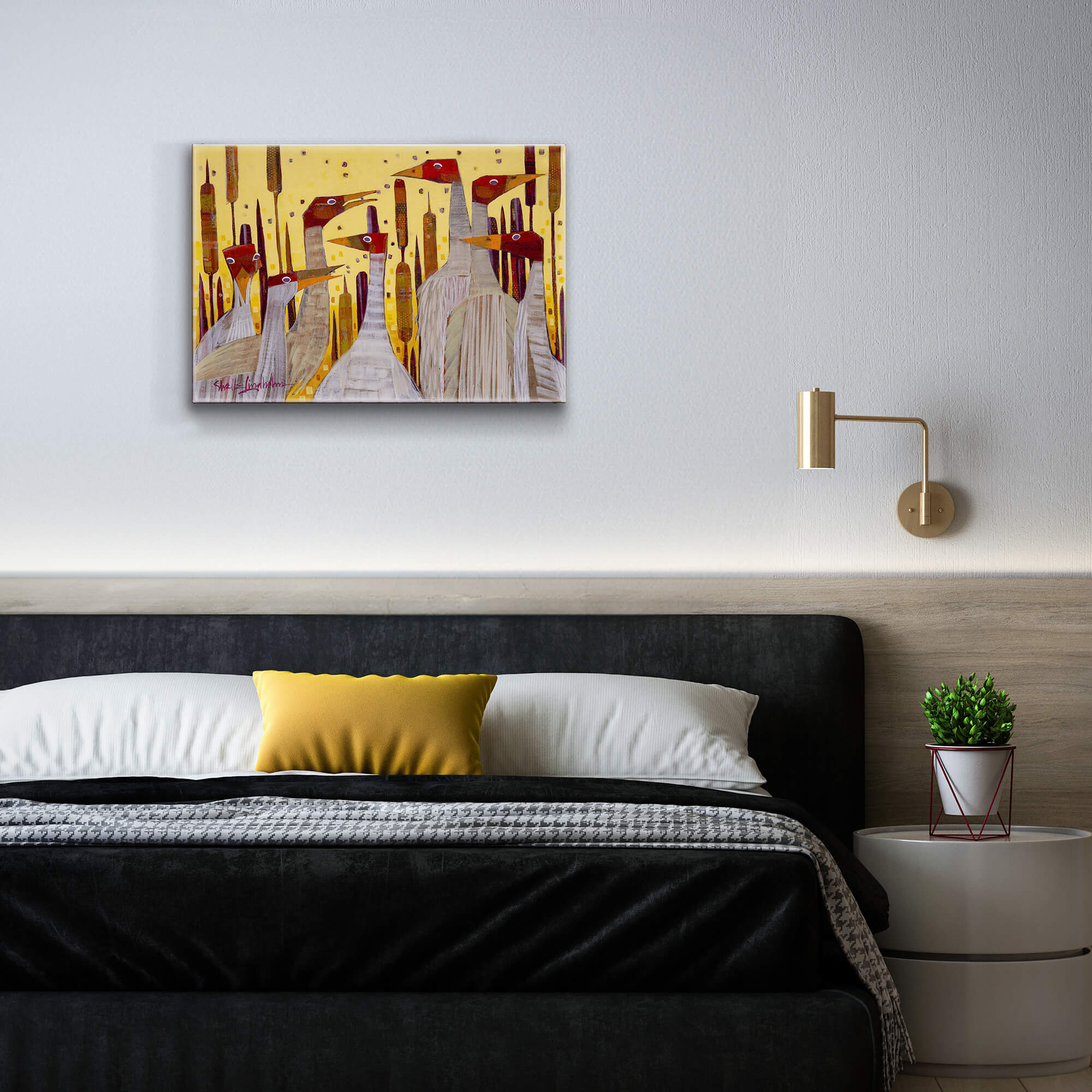 Enhance your space with this stunning artwork, featuring a gathering of elegant cranes amidst tall reeds on a warm yellow backdrop. The intricate textures and earthy tones bring a sense of calm and natural beauty to any room. Perfect for nature lovers and art enthusiasts, this piece adds a unique and inviting focal point to your decor.