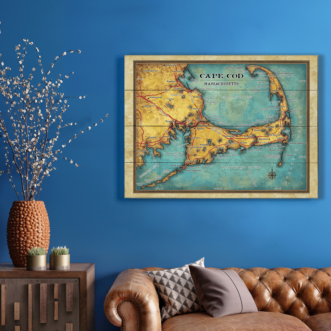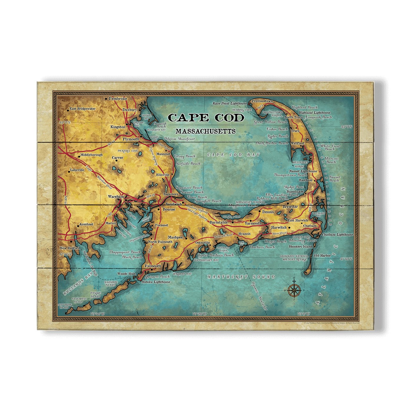 Explore the historic charm of Cape Cod, Massachusetts with this beautifully illustrated map. Rich in detail and vibrant colors, it captures the unique geography and notable landmarks of the Cape, from Plymouth to Provincetown. Ideal for history buffs, nautical enthusiasts, and lovers of New England, this map merges artistic flair with geographic precision, making it a stunning decorative piece for any home or office. Celebrate the iconic beauty of Cape Cod with this exquisite map, perfect for anyone charmed by the allure of the Atlantic coast.