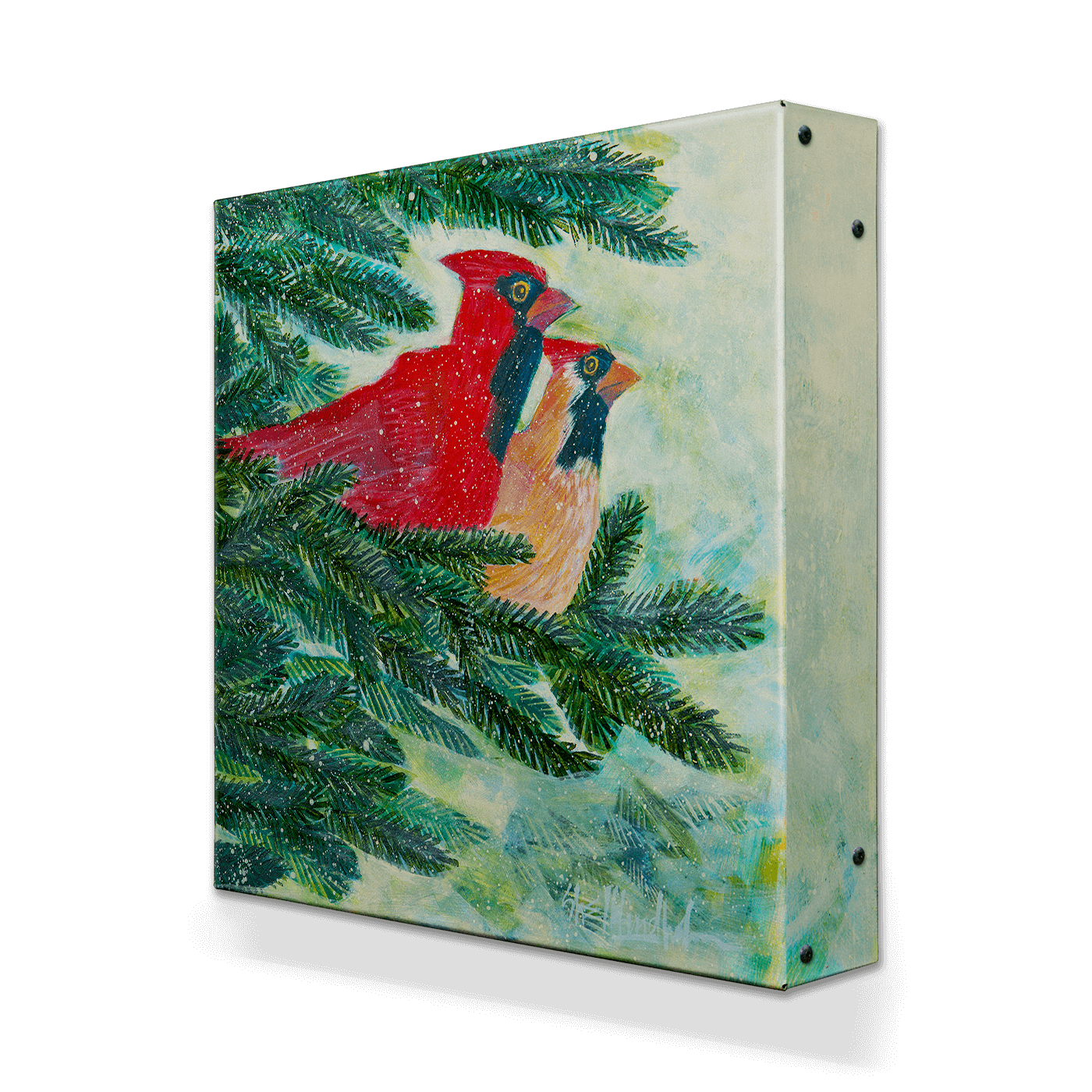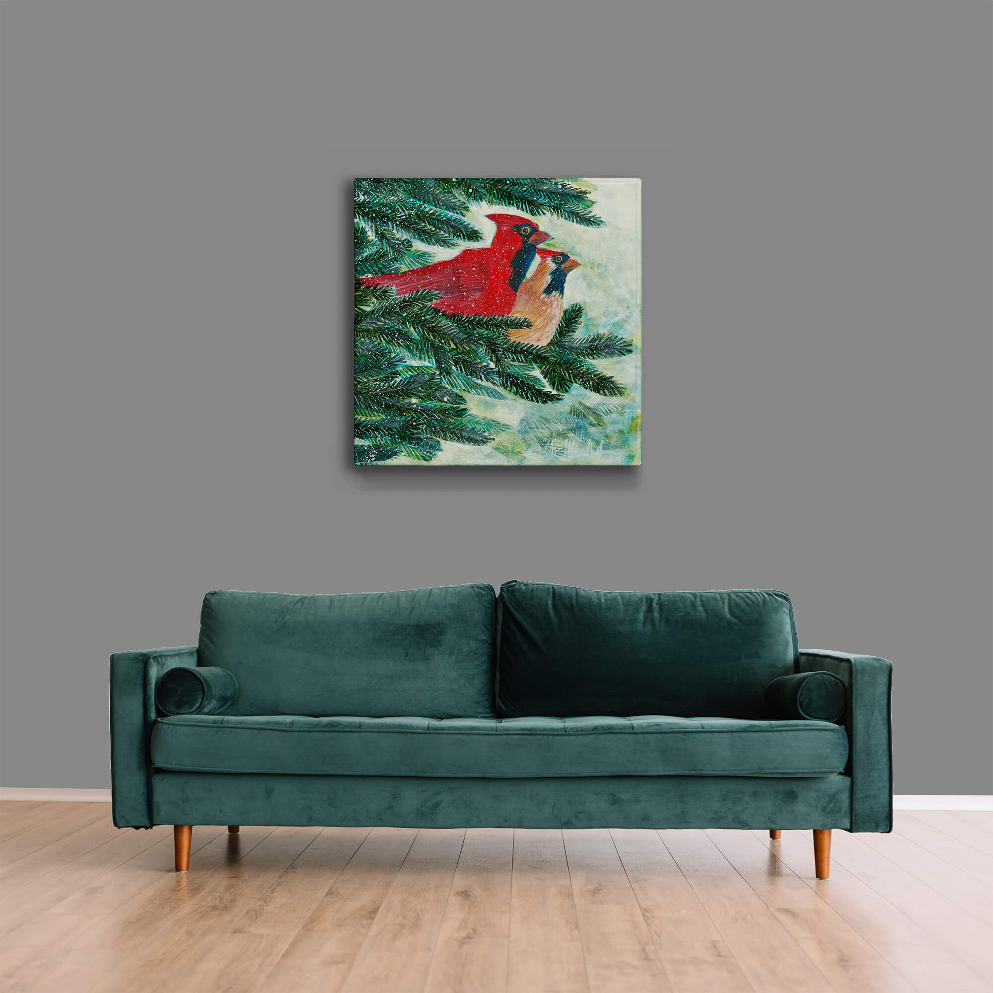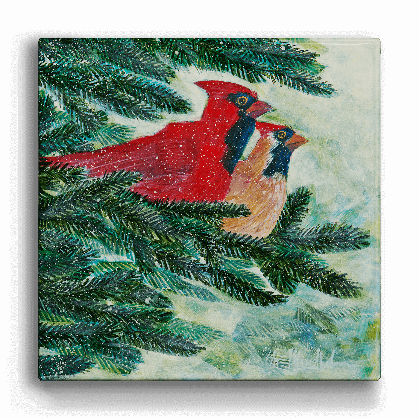 This serene artwork captures the beauty of two cardinals nestled among the lush green branches of an evergreen tree, gently dusted with falling snow. The vibrant red of the male cardinal contrasts beautifully with the softer tones of the female, creating a harmonious and heartwarming winter scene. Perfect for bringing the quiet magic of nature indoors, this piece evokes a sense of peace and connection with the natural world.