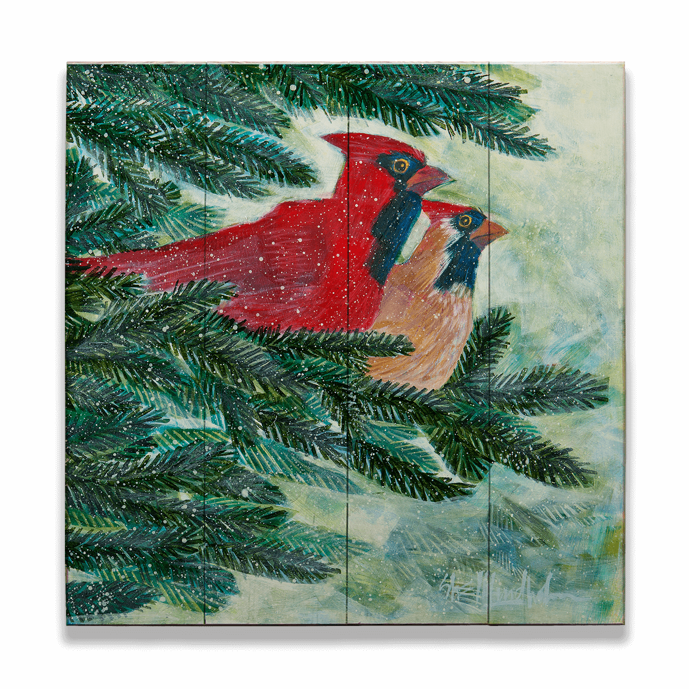 This serene artwork captures the beauty of two cardinals nestled among the lush green branches of an evergreen tree, gently dusted with falling snow. The vibrant red of the male cardinal contrasts beautifully with the softer tones of the female, creating a harmonious and heartwarming winter scene. Perfect for bringing the quiet magic of nature indoors, this piece evokes a sense of peace and connection with the natural world.