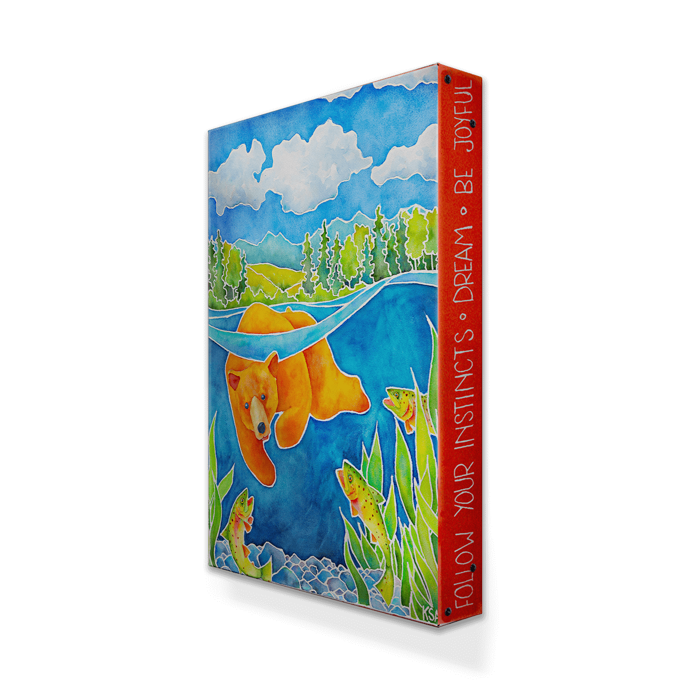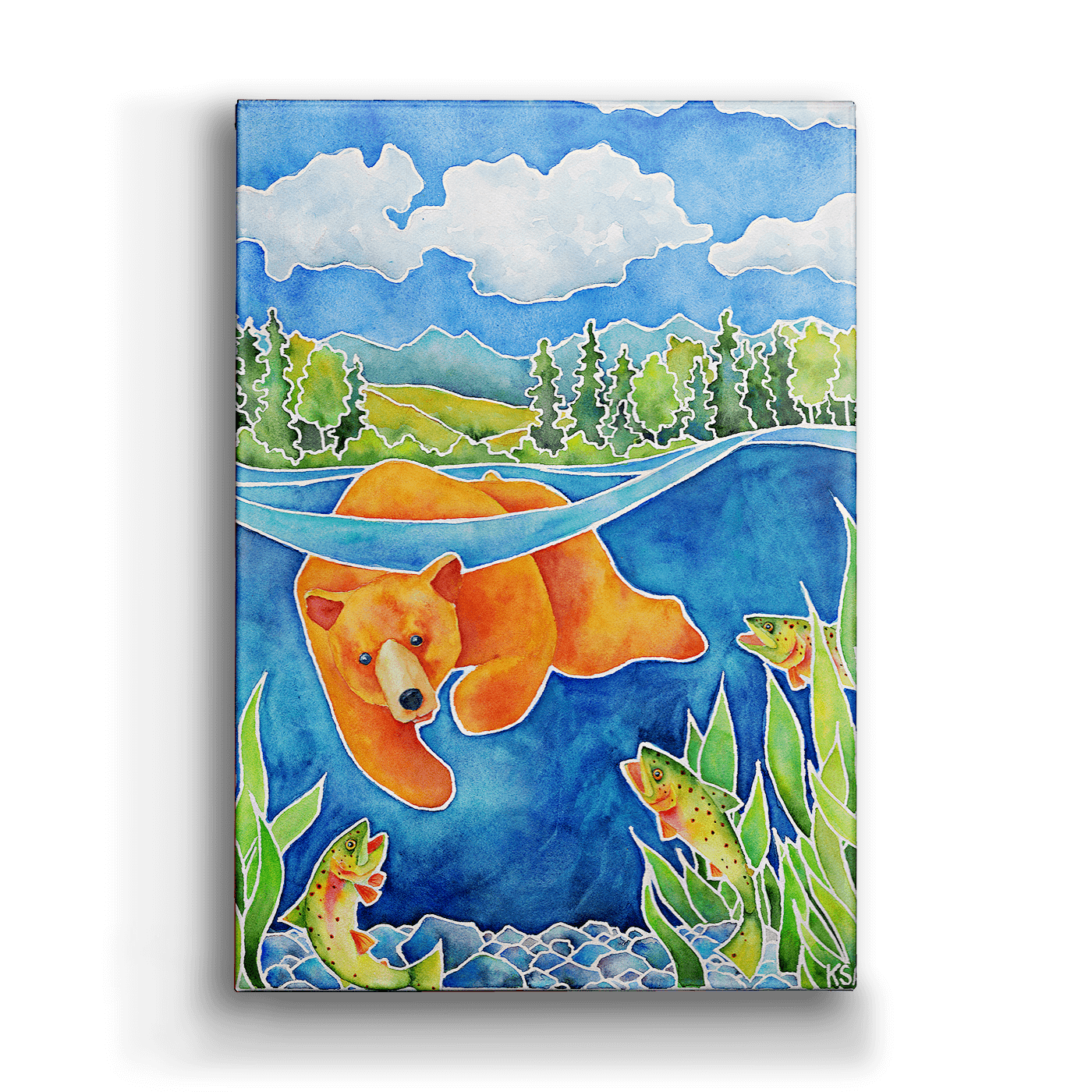Dive into the playful side of nature with this charming artwork featuring a curious bear swimming with fish in a vibrant river scene. Surrounded by uplifting phrases, this piece celebrates adventure, curiosity, and the simple joys of life. The bold colors and whimsical composition capture the energy of the outdoors, making it perfect for animal lovers and those who seek art that inspires wonder and gratitude.