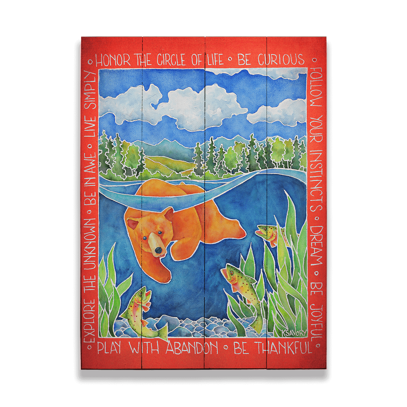 Dive into the playful side of nature with this charming artwork featuring a curious bear swimming with fish in a vibrant river scene. Surrounded by uplifting phrases, this piece celebrates adventure, curiosity, and the simple joys of life. The bold colors and whimsical composition capture the energy of the outdoors, making it perfect for animal lovers and those who seek art that inspires wonder and gratitude.