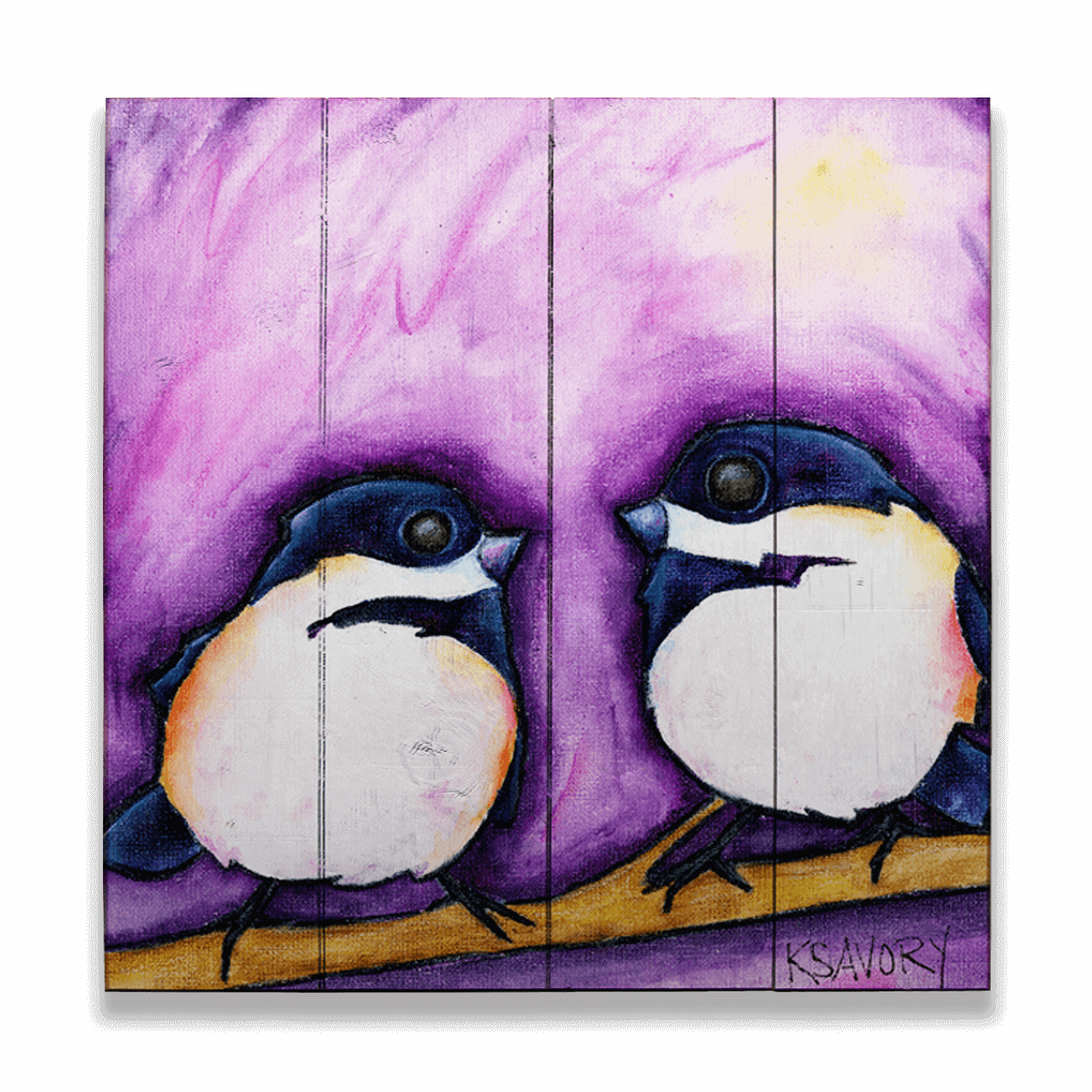 This charming artwork captures two adorable chickadees perched side by side, set against a soft purple background. The vibrant color palette and the endearing expressions of the birds create a warm, inviting atmosphere. This piece is perfect for bird lovers and art collectors who appreciate nature-inspired art with a whimsical touch. The simplicity and beauty of the composition make it a delightful addition to any room, adding a serene and cheerful vibe.