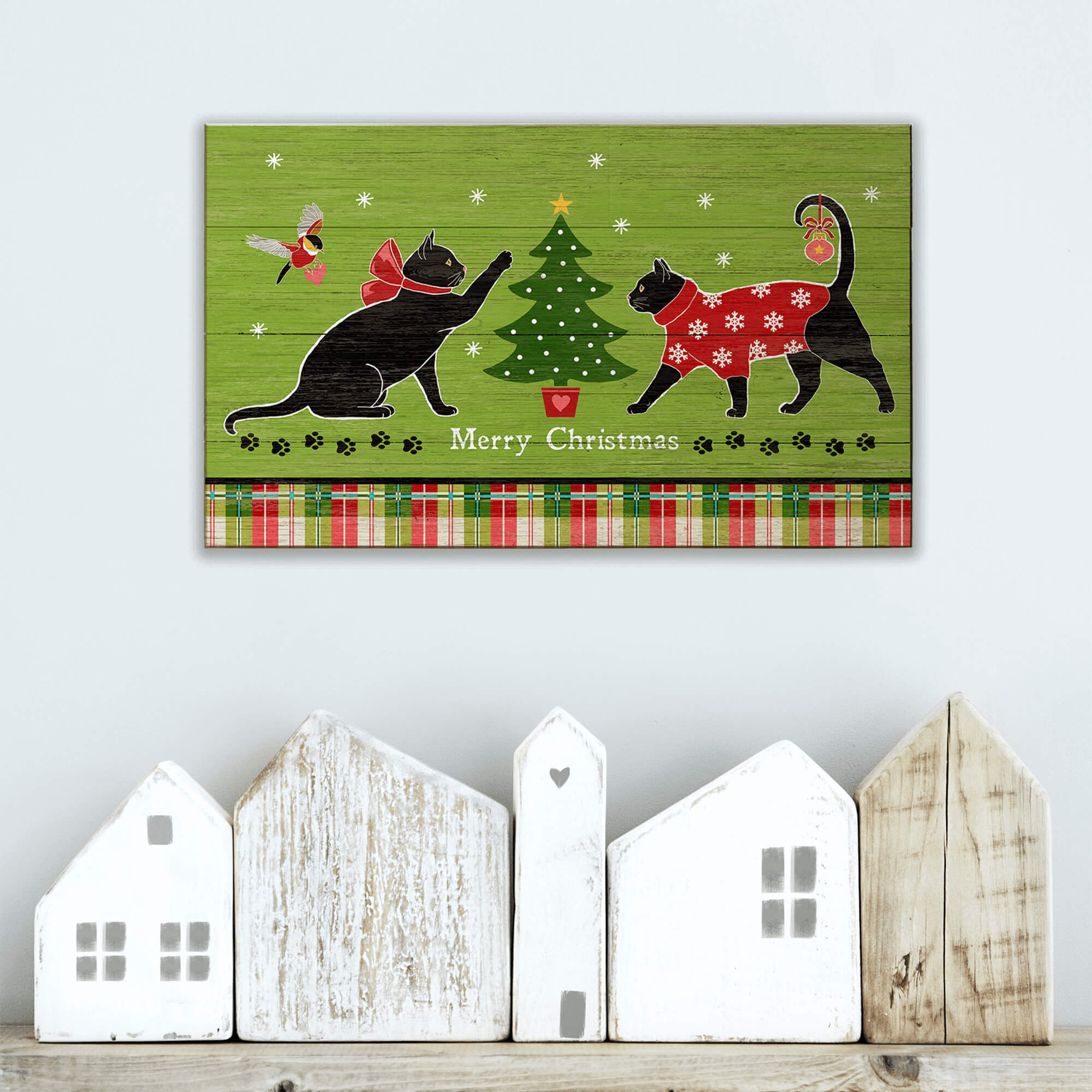 This festive holiday artwork showcases two playful cats dressed in adorable winter outfits, surrounded by a decorated Christmas tree and a cheerful bird. Set against a vibrant green background with plaid accents and the message "Merry Christmas," this piece brings a whimsical touch to your seasonal decor. Perfect for cat lovers and those who enjoy adding fun, lighthearted elements to their holiday decorations, this artwork is ideal for creating a cozy and joyful atmosphere during the Christmas season.