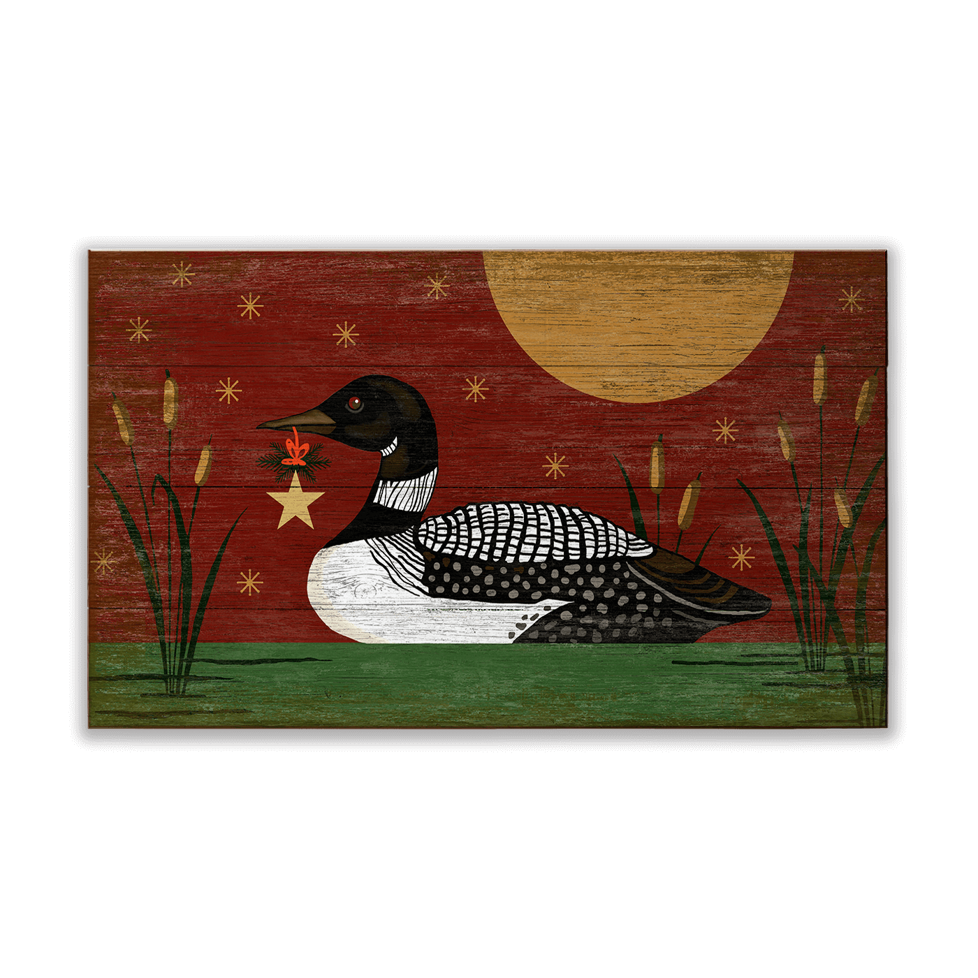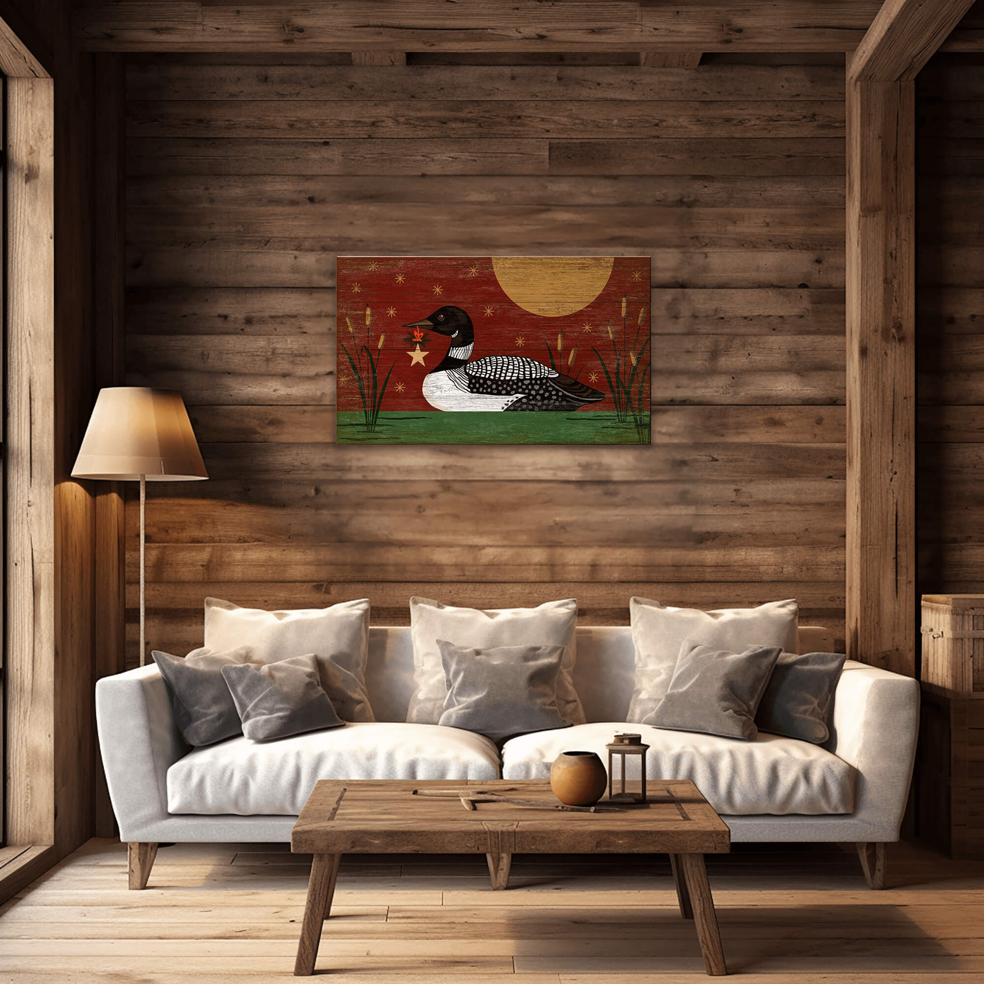 This rustic holiday artwork features a beautifully illustrated loon gracefully floating on a serene lake, holding a festive ornament in its beak. Set against a rich, warm red background with a golden moon and star accents, the piece evokes a peaceful, nature-inspired charm. The weathered wood texture adds a cozy, nostalgic feel, making it an ideal addition to holiday decor for nature lovers and those who appreciate wildlife art. Perfect for bringing a touch of woodland beauty and festive spirit into your home this Christmas season.