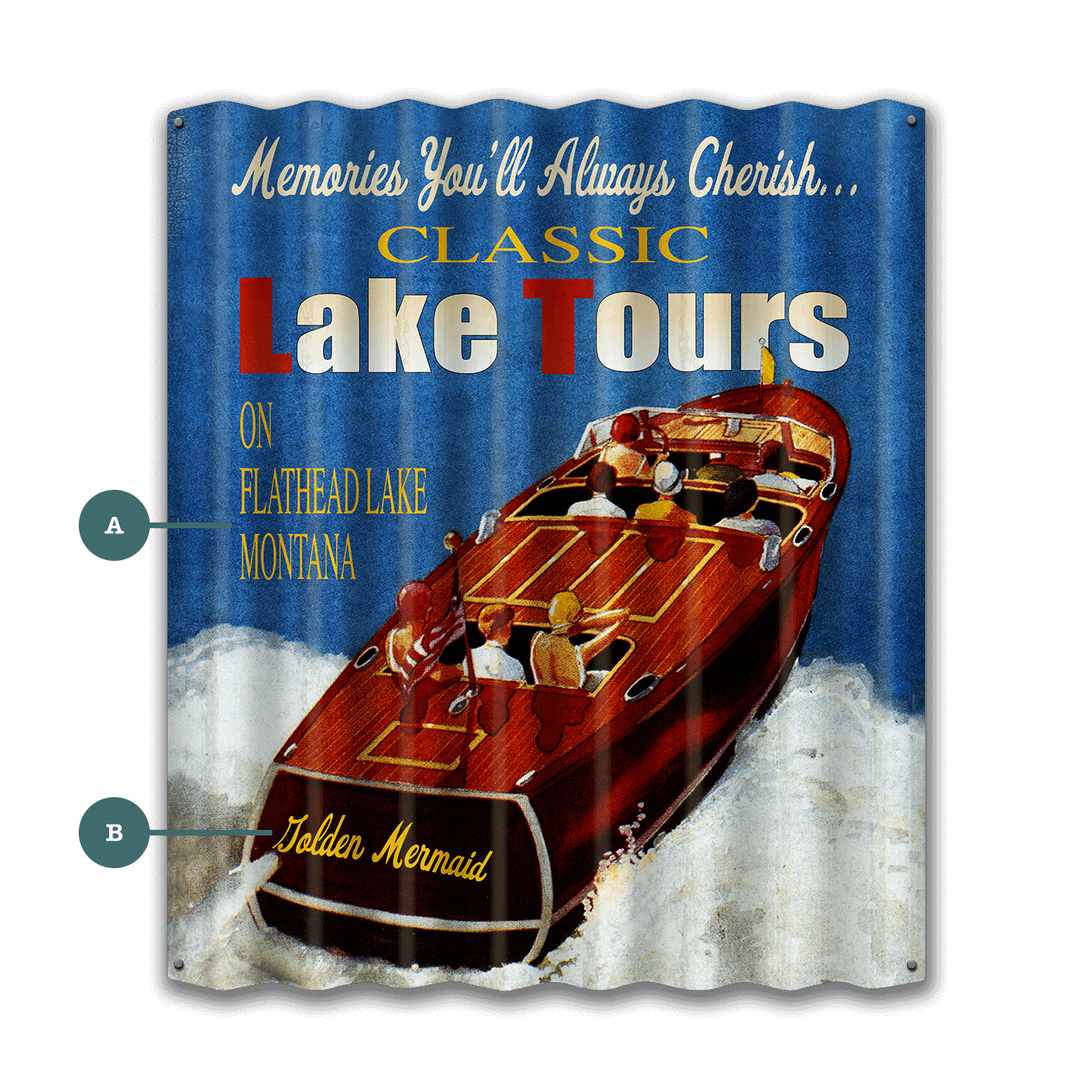 Experience the charm of classic lake tours with this vintage sign. Featuring a beautifully illustrated wooden boat cruising through the water, this artwork captures the joy and nostalgia of timeless lake adventures. The rich colors and retro design make it a perfect addition to any decor, adding a touch of history and elegance. Ideal for home, office, or business settings, this sign brings a sense of adventure and cherished memories to any space.