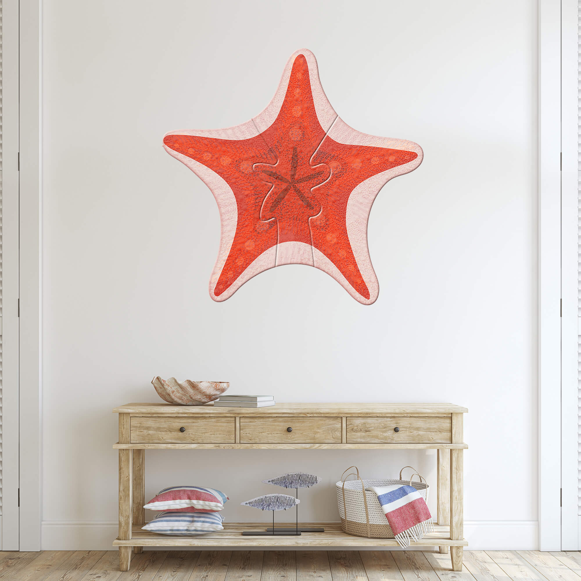 Transform your space with this starfish-shaped wooden wall art, available in Coral, Teal, and Yellow. Offered in two sizes: 40"x40" and 62"x62", this eye-catching piece arrives in three separate parts and is easily assembled into its iconic starfish shape. Once completed, it becomes a stunning statement piece for coastal or nautical-themed spaces. Designed for wall display, this durable and beautifully crafted artwork brings the charm of the ocean to your home or office.