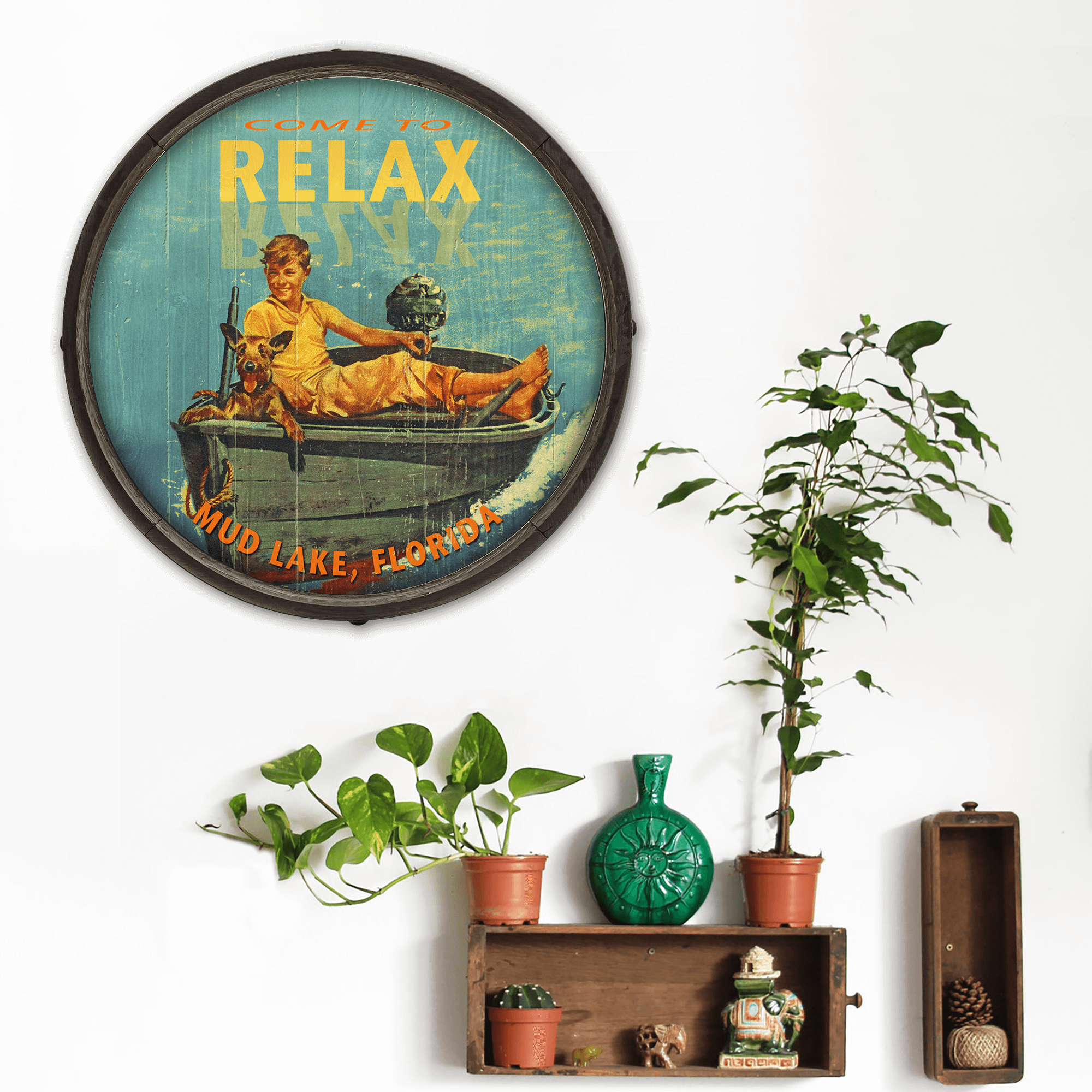 Step back in time with our 'Come to Relax' vintage-style artwork, capturing the essence of laid-back, mid-century leisure. This charming piece features a joyful scene of a young boy and his dog, both relishing a calm boat ride on a serene lake. With its vibrant colors and nostalgic appeal, this artwork is perfect for adding a touch of retro flair to your home or office. Ideal for collectors of vintage posters or anyone looking to infuse a bit of whimsical, old-school charm into their décor.
