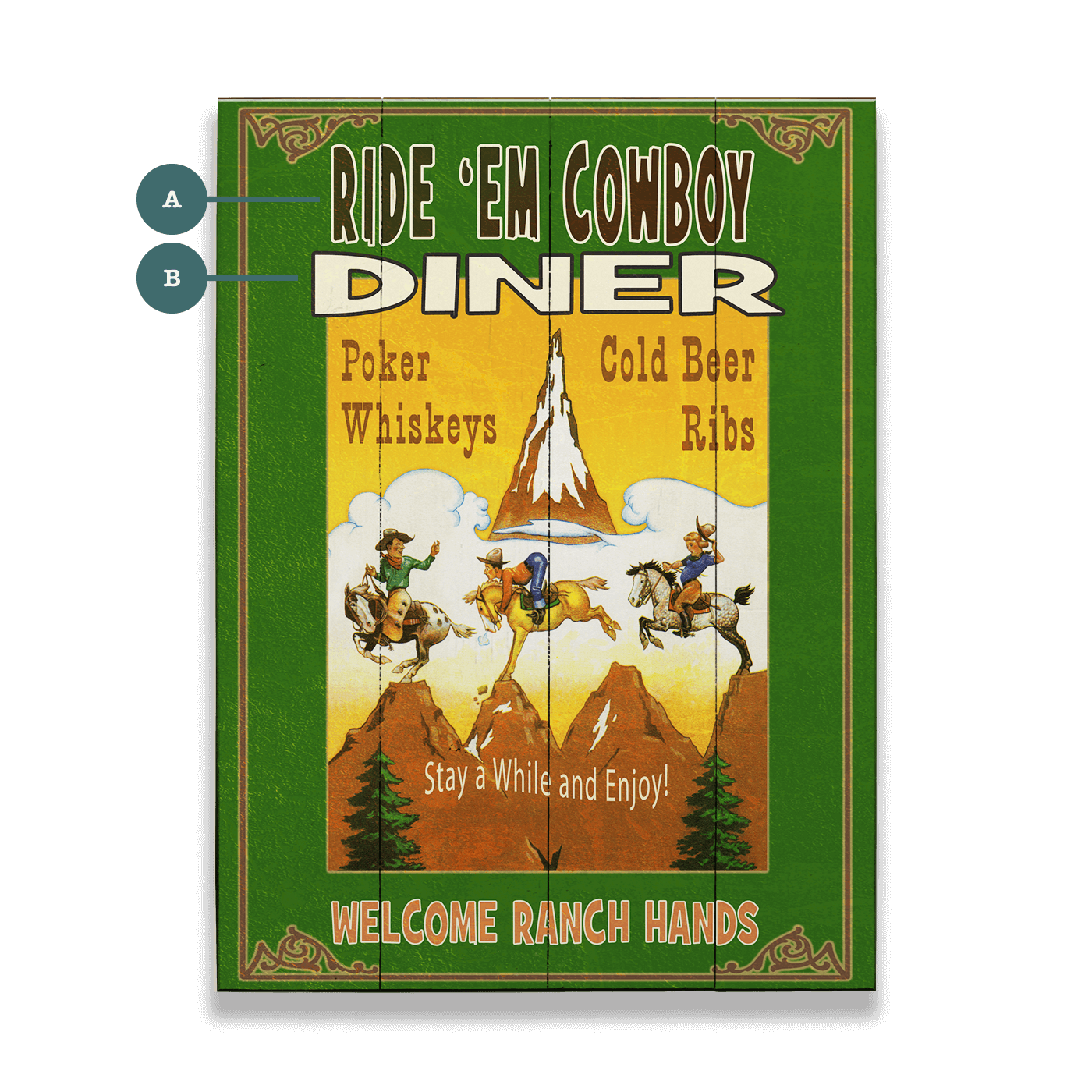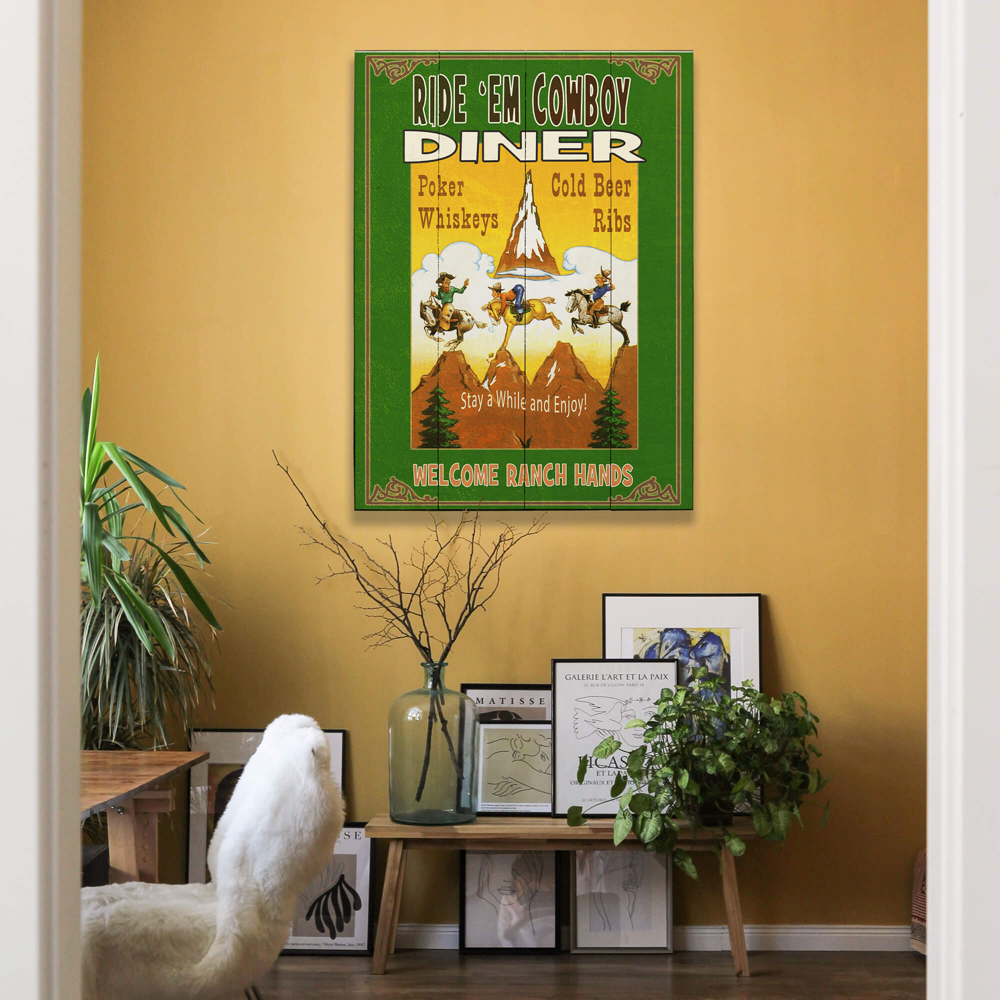 Saddle up and step into a place where the frontier spirit is alive and well. This vibrant sign, with its deep green frame and bold lettering, invites ranch hands to a haven of hearty meals, cold drinks, and good company. The humorous illustration of cowboys galloping from peak to peak embodies the daring adventure of the West. Whether you're drawn by the promise of poker, whiskey, or a sizzling plate of ribs, this piece captures the essence of camaraderie and adventure in a setting where every guest is welcomed with open arms.