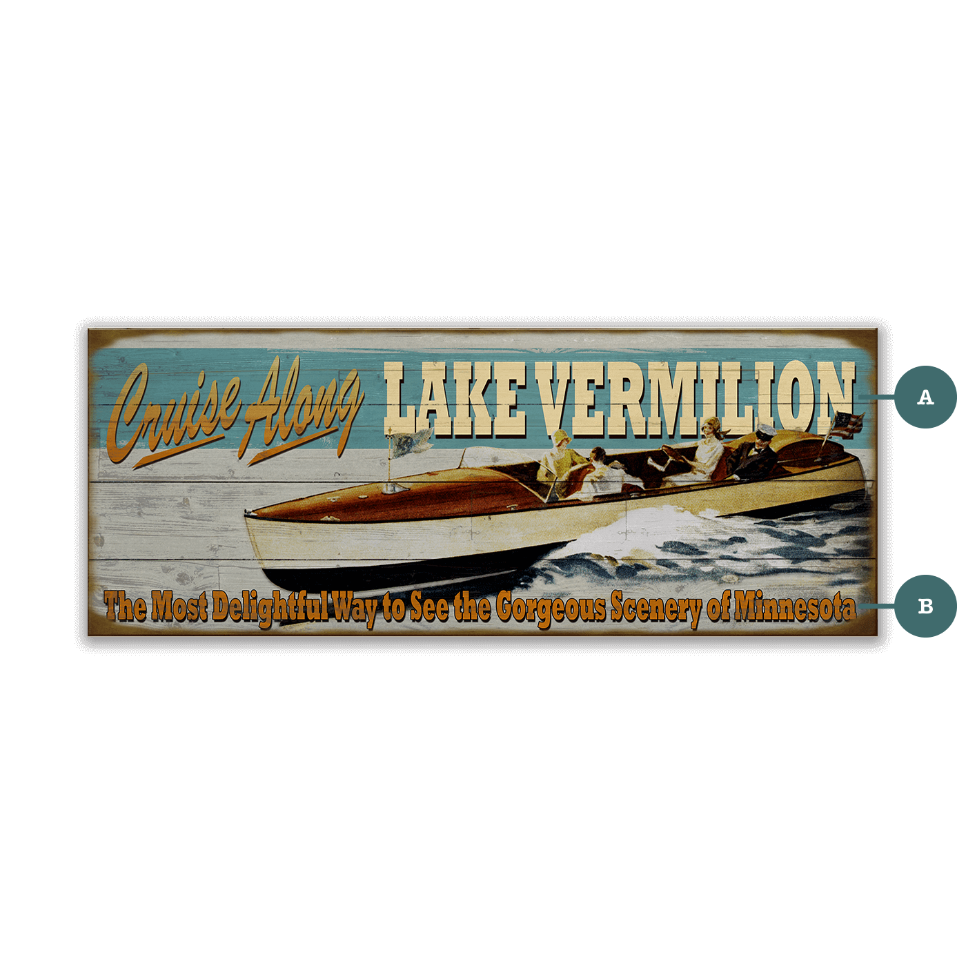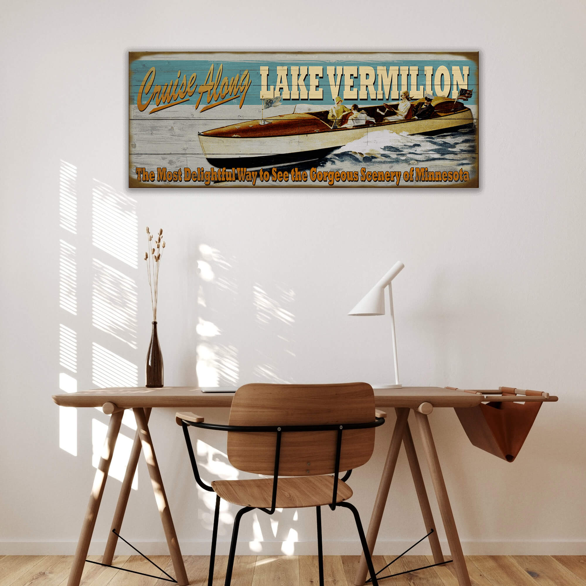 Experience the charm of cruising on our vintage-inspired sign! This artwork beautifully showcases a delightful boat ride, making it 'The Most Delightful Way to See the Gorgeous Scenery' of the great outdoors. The design, coupled with the allure of smooth waters and clear skies, invites you to imagine leisurely days spent in the company of friends and family. Perfect for anyone looking to add a touch of classic nautical style to their home decor.