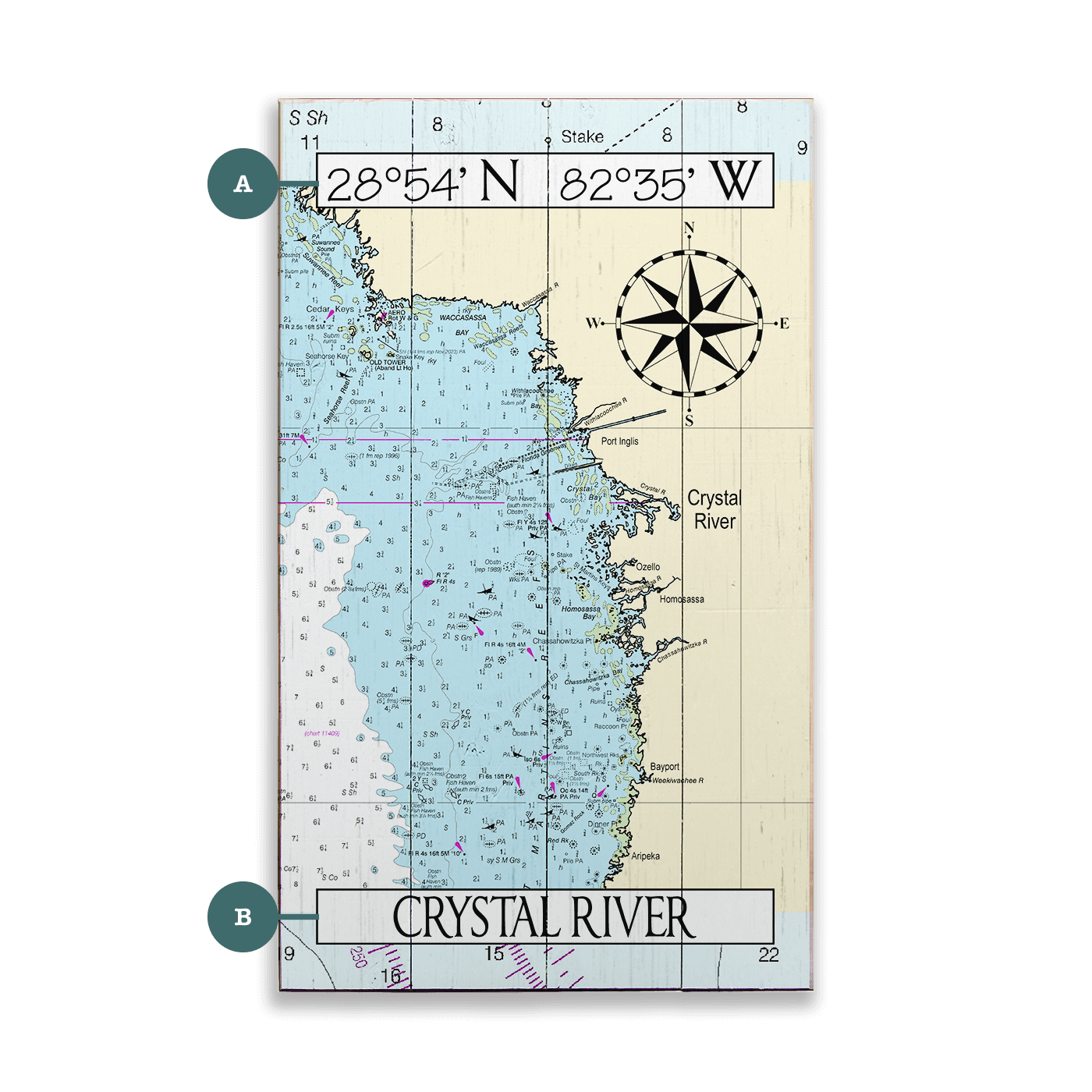 This artwork features a detailed chart of Crystal River, Florida, showcasing the beautiful coastal region with the coordinates (28°54' N, 82°35' W) and a decorative compass rose. The name and coordinates can be customized, allowing you to create a personalized piece that reflects your connection to this scenic location. Perfect for coastal-themed decor, this artwork brings the natural beauty and charm of Crystal River into any space.