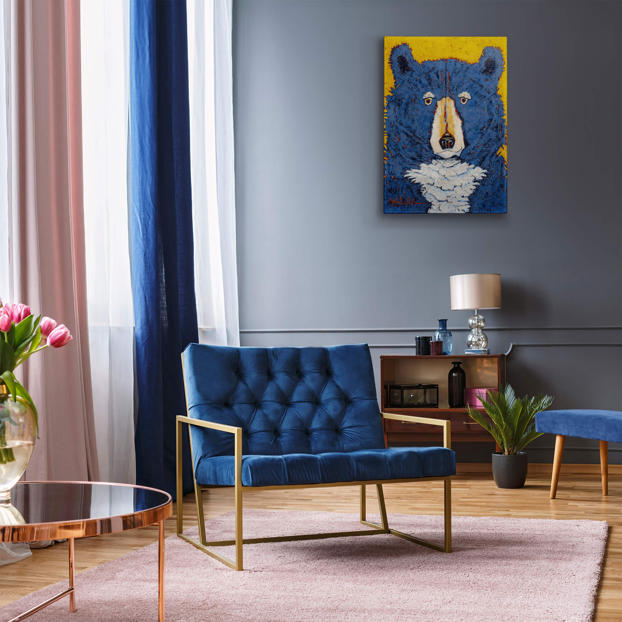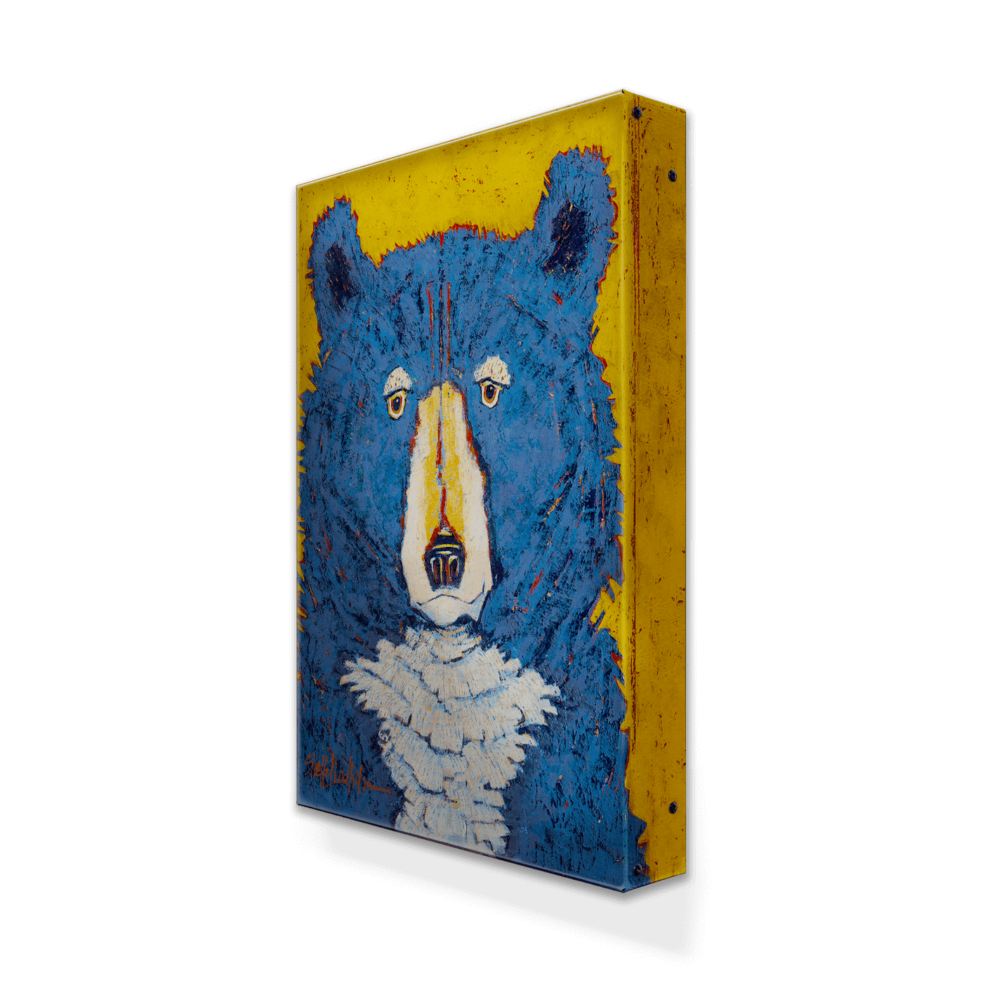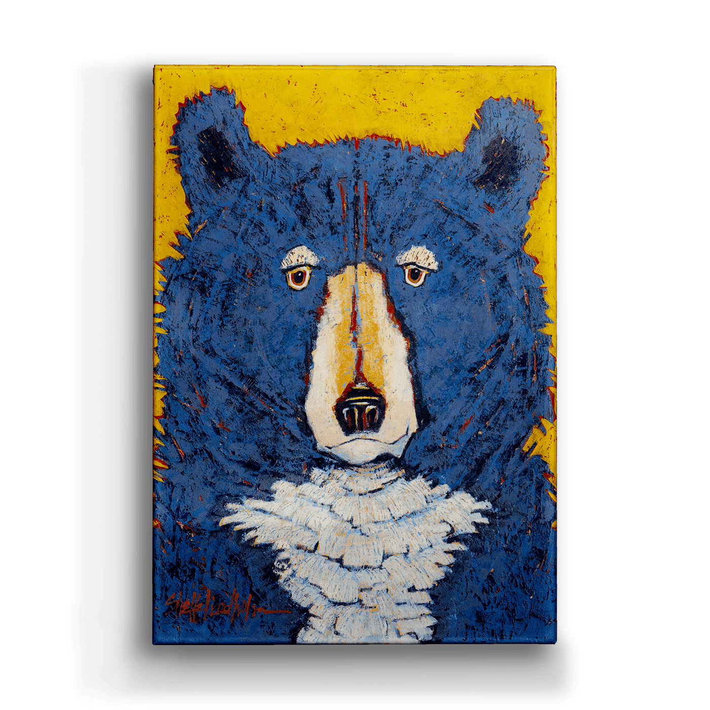 The bold and captivating artwork features a striking blue bear with expressive eyes against a vibrant yellow background. The thick, textured strokes give the bear a unique, almost abstract appearance, highlighting the artist's playful yet powerful interpretation of this majestic animal. Perfect for adding a splash of color and personality to any space, this piece merges contemporary style with nature's beauty. Ideal for wildlife enthusiasts and modern art collectors alike.
