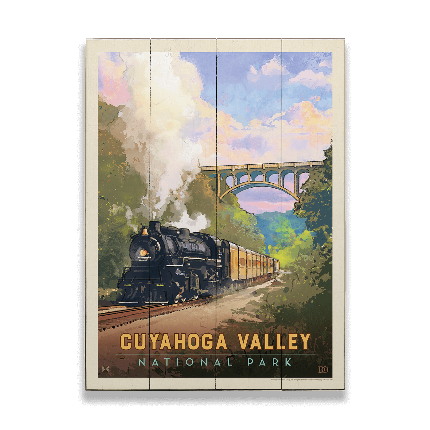 Relive the romance of rail travel with this nostalgic artwork of Cuyahoga Valley National Park. A steam locomotive winds its way through lush greenery, trailing a plume of smoke beneath a historic arched bridge and pastel sky. Nestled between two major cities, this unique park blends natural beauty with cultural heritage, offering scenic trails, waterfalls, and the iconic Cuyahoga Valley Scenic Railroad. This piece captures the park’s timeless charm and celebrates a landscape where history and nature roll side by side.