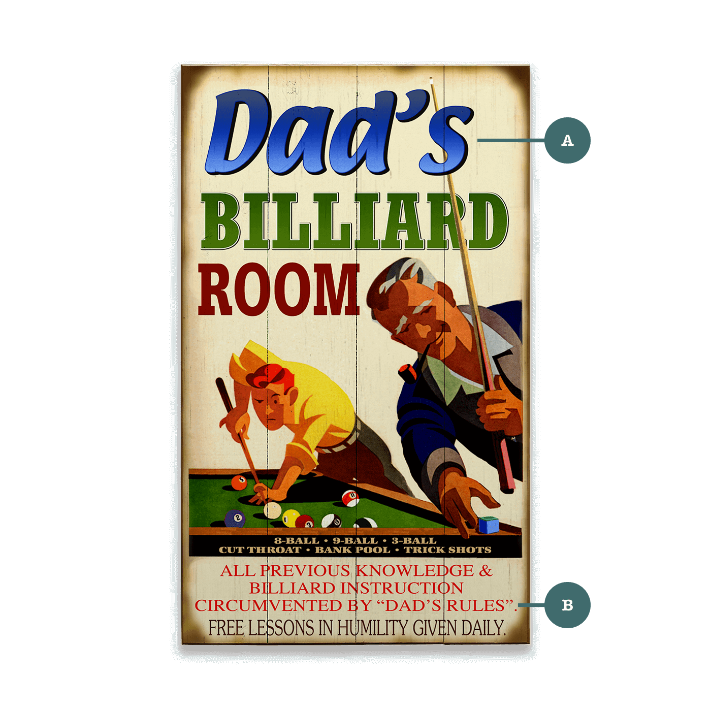 Step into a world of playful competition with 'Dad's Billiard Room,' a vibrant and nostalgic artwork that captures the spirit of classic pool games. Featuring dynamic illustrations of players in action and playful text, this piece is perfect for decorating any game room or living space. It adds a touch of retro flair and family fun, making it an ideal gift for the billiard-loving dad who enjoys sharing the joy of the game with friends and family.