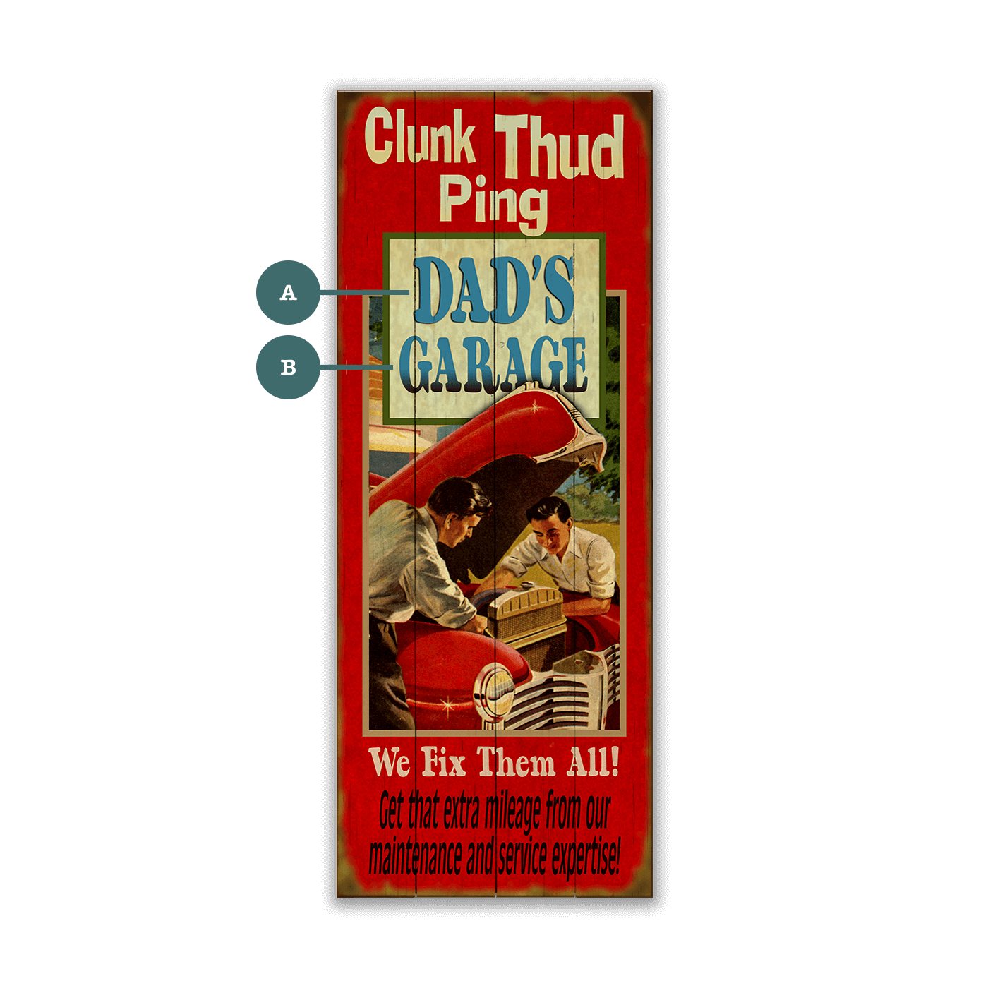 Step back in time with this charming poster titled "Clunk Thud Ping – Dad's Garage," which captures the essence of classic car maintenance and the timeless bond it fosters. The artwork features a nostalgic scene with two individuals engrossed in car repairs, evoking the feel of a bygone era where every ding was a story and every repair a lesson passed from father to son. With the slogan "We Fix Them All! Get that extra mileage from our maintenance and service expertise!" this poster is perfect for hanging in personal workshops, garages, or as a gift to the car enthusiast in your life.