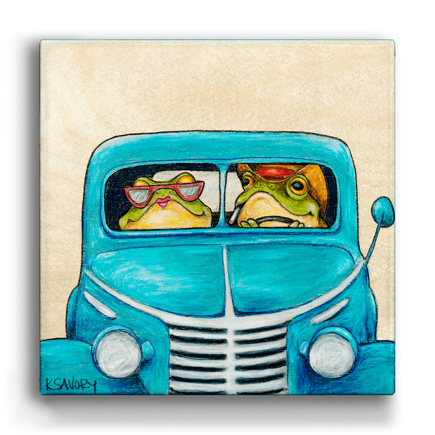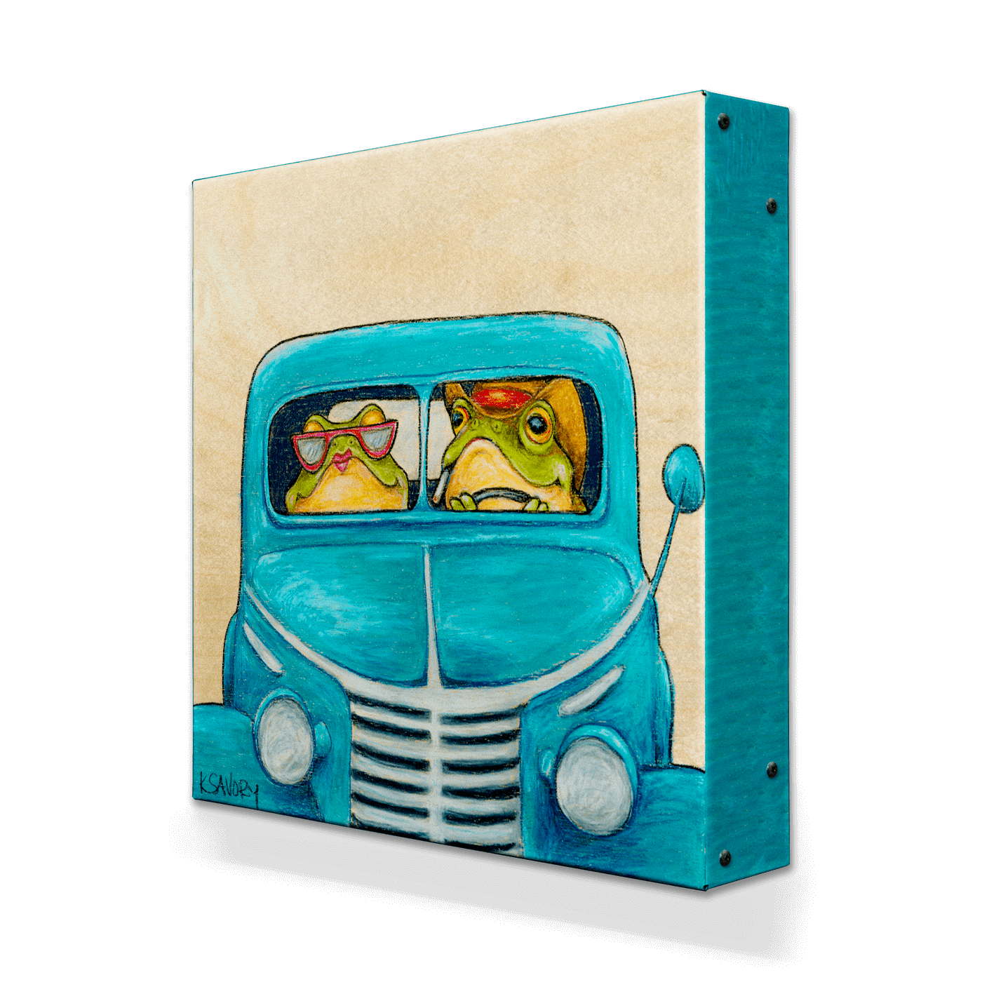 Add a dose of humor and charm to your decor with this whimsical artwork featuring two frogs cruising in a vintage blue truck. Bursting with charm and personality, this playful frog couple done up in retro fashion adds a whimsical touch to any space. Perfect for anyone who loves unique, lighthearted art, this artwork brings a smile and a touch of the unexpected.