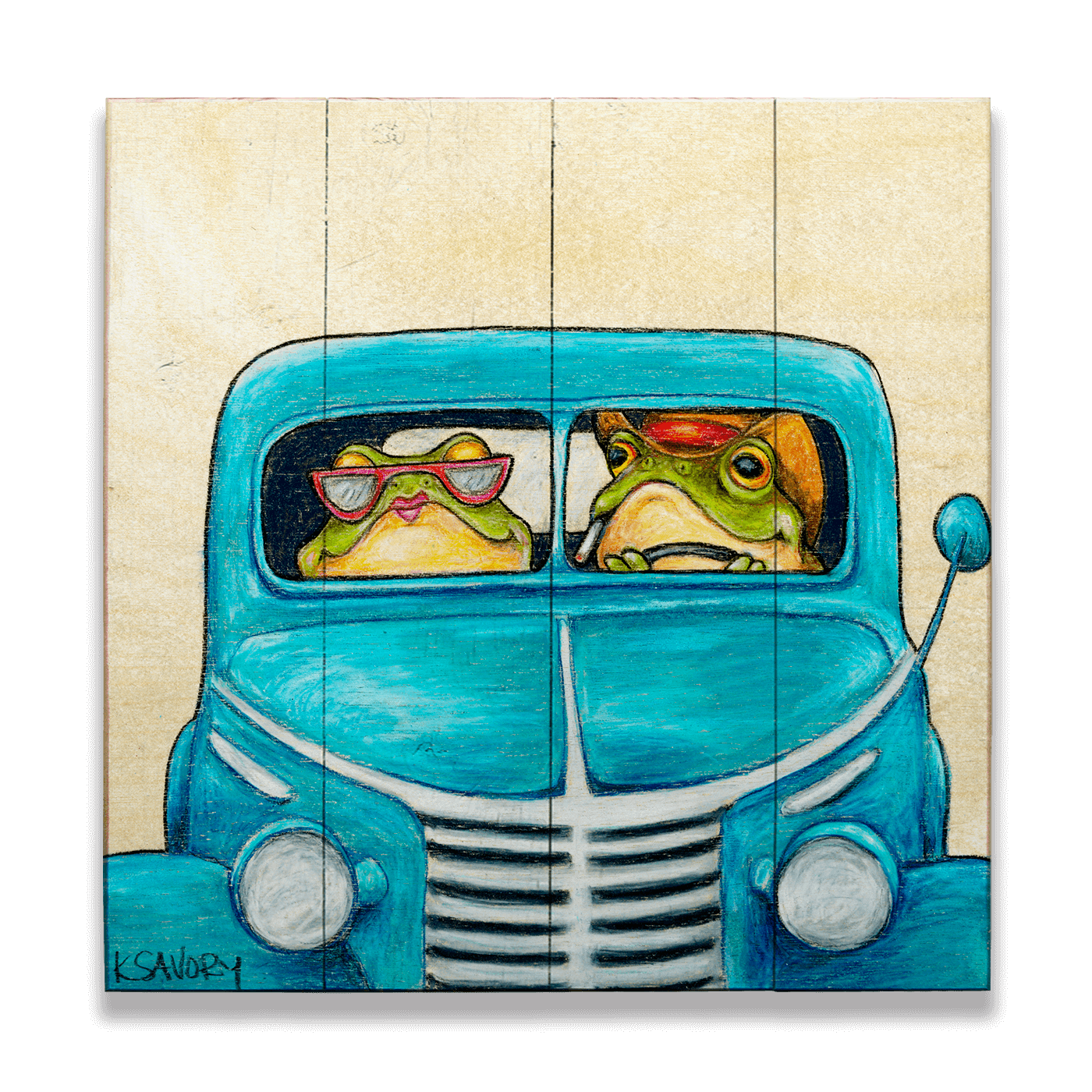 Add a dose of humor and charm to your decor with this whimsical artwork featuring two frogs cruising in a vintage blue truck. Bursting with charm and personality, this playful frog couple done up in retro fashion adds a whimsical touch to any space. Perfect for anyone who loves unique, lighthearted art, this artwork brings a smile and a touch of the unexpected.