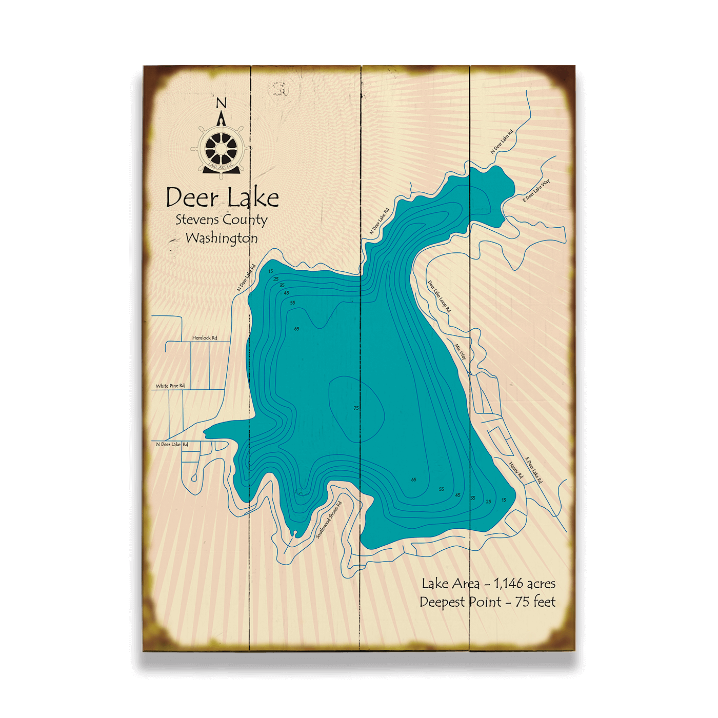Immerse yourself in the topographic splendor of Deer Lake with this elegantly designed map artwork. Nestled in Stevens County, Washington, this vintage-inspired piece showcases the lake's expansive 1,146-acre surface area and its impressive depth that plunges to 75 feet. This piece of art is not just a visual delight but an informative gem, making it a perfect addition for those who appreciate the blend of natural beauty and cartographic precision. Bring the allure of Deer Lake into your space and celebrate the geography of Washington in style.