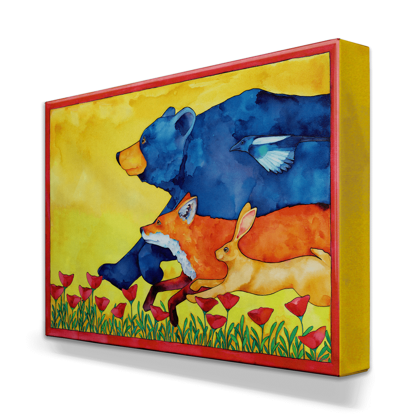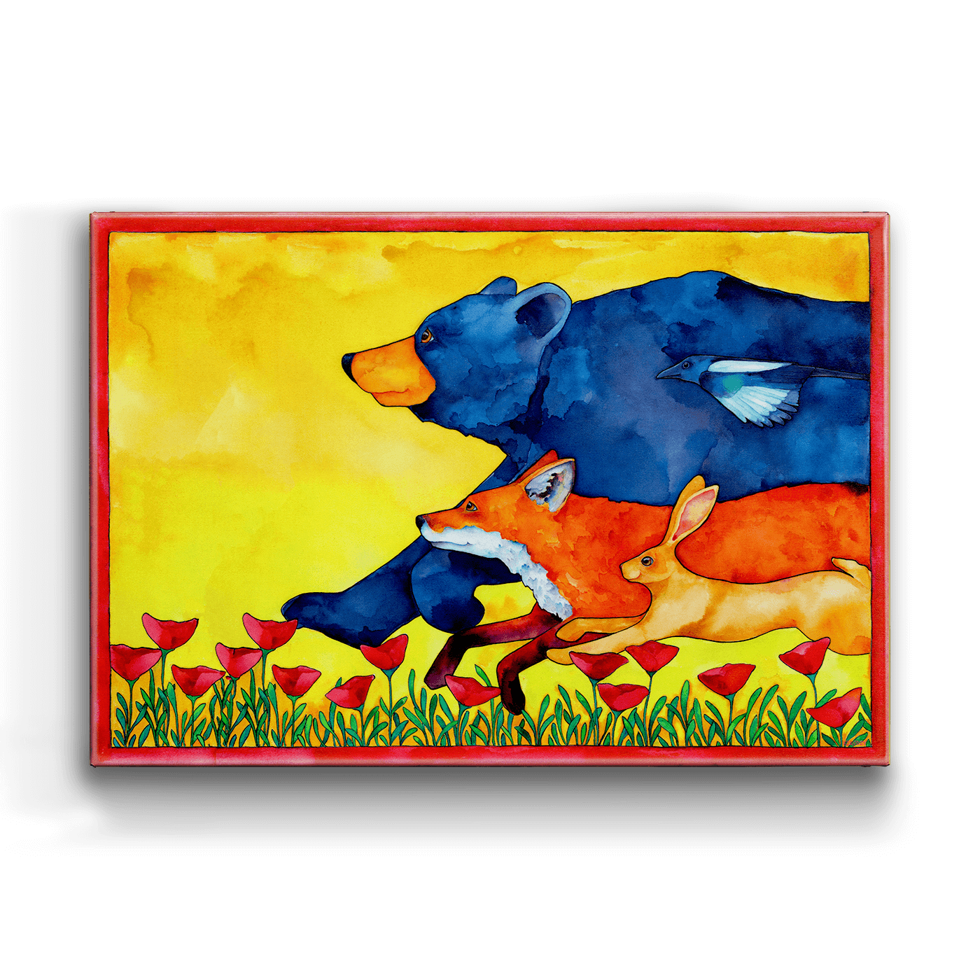 Embrace the joyful energy of the great outdoors with this charming portrayal of nature’s harmony in motion as a bear, fox, hare, and bird run side by side across a field of blooming red flowers. Set against a sunny yellow backdrop, each animal’s vivid color and lively expression convey a sense of unity and freedom in nature. Perfect for animal lovers and those who enjoy dynamic, colorful art, this piece brings a playful spirit and a touch of wilderness adventure to any space.