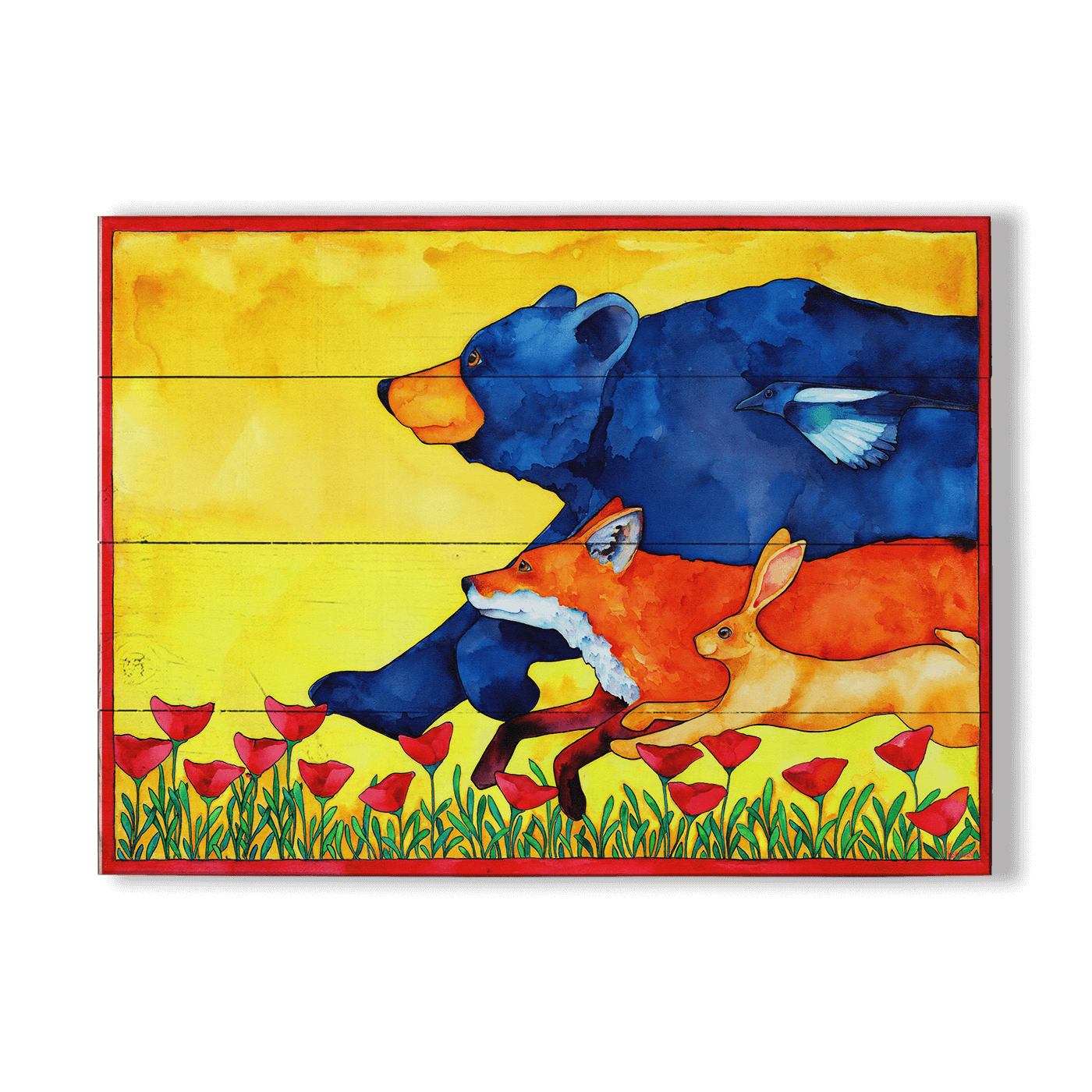 Embrace the joyful energy of the great outdoors with this charming portrayal of nature’s harmony in motion as a bear, fox, hare, and bird run side by side across a field of blooming red flowers. Set against a sunny yellow backdrop, each animal’s vivid color and lively expression convey a sense of unity and freedom in nature. Perfect for animal lovers and those who enjoy dynamic, colorful art, this piece brings a playful spirit and a touch of wilderness adventure to any space.