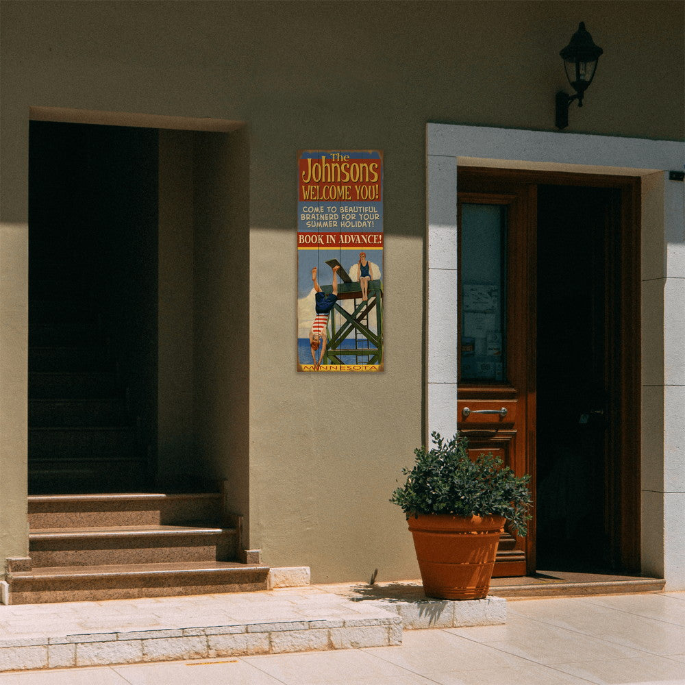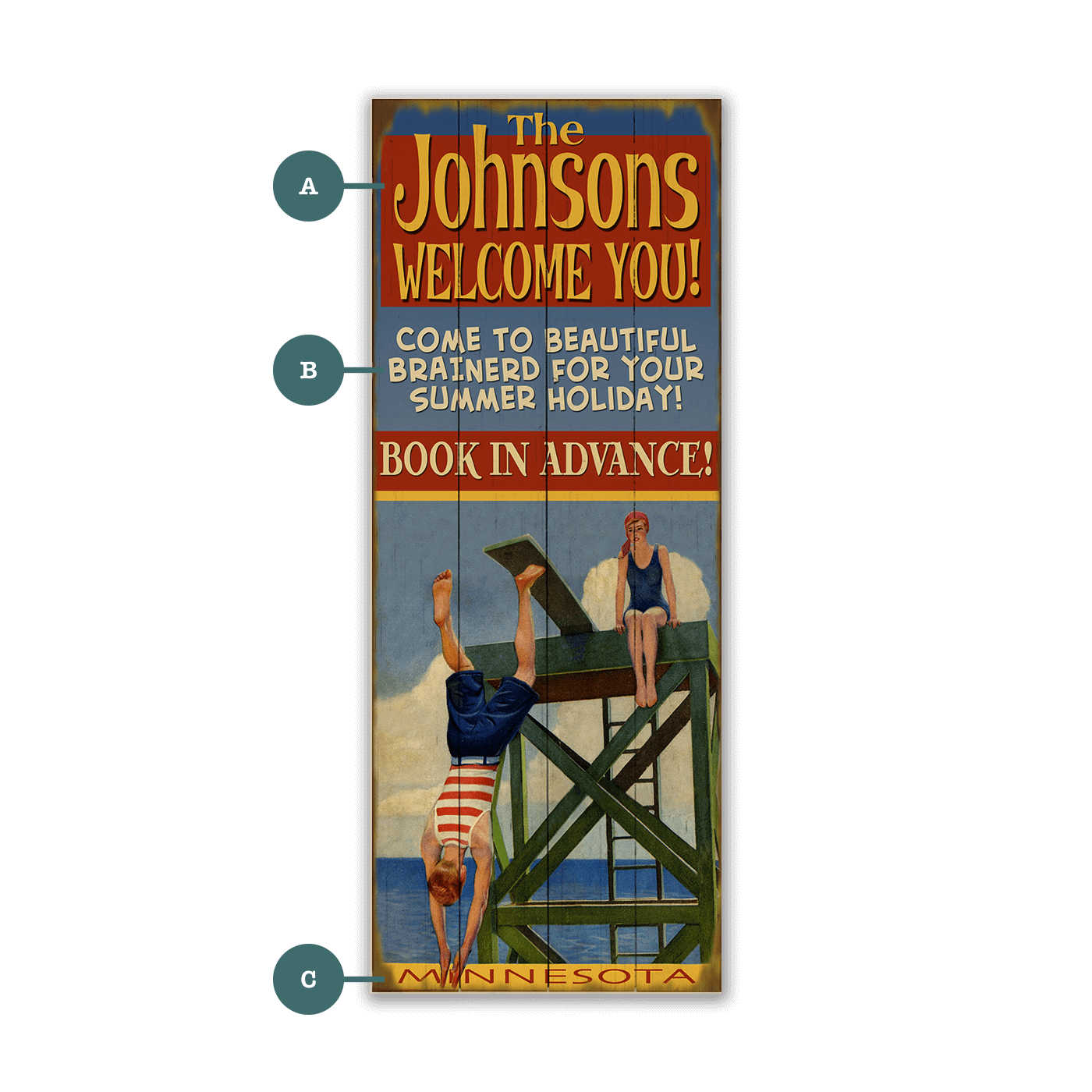 Invite the joy of summer holidays into your space with this charming lakeside scene, bursting with nostalgia and playful energy. Featuring a lively moment on a diving tower—one figure mid-dive into the refreshing water while another looks on with a smile—this artwork captures the carefree fun of vacation days spent by the lake. Bold lettering and rich, vintage tones create a warm, welcoming atmosphere perfect for cabins, lodges, or guest spaces. With its call to enjoy the beauty of the outdoors, this piece celebrates classic summer adventures and the timeless appeal of lakeside living.