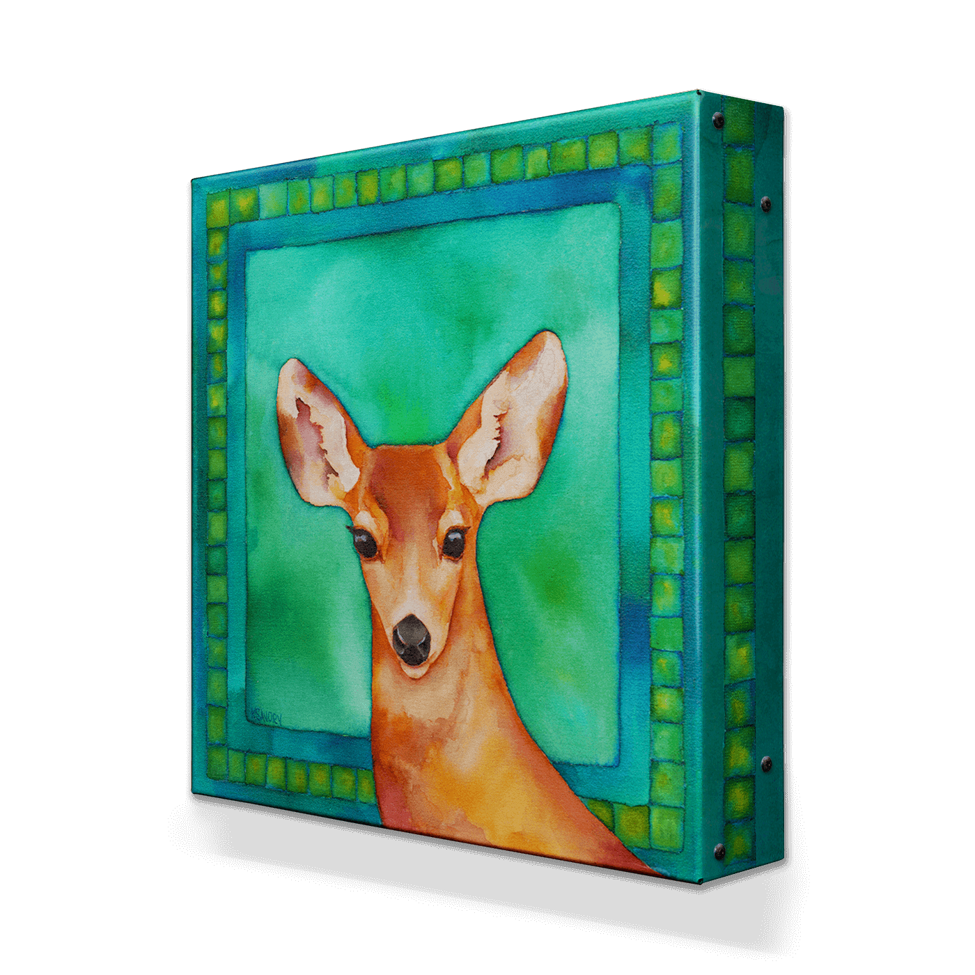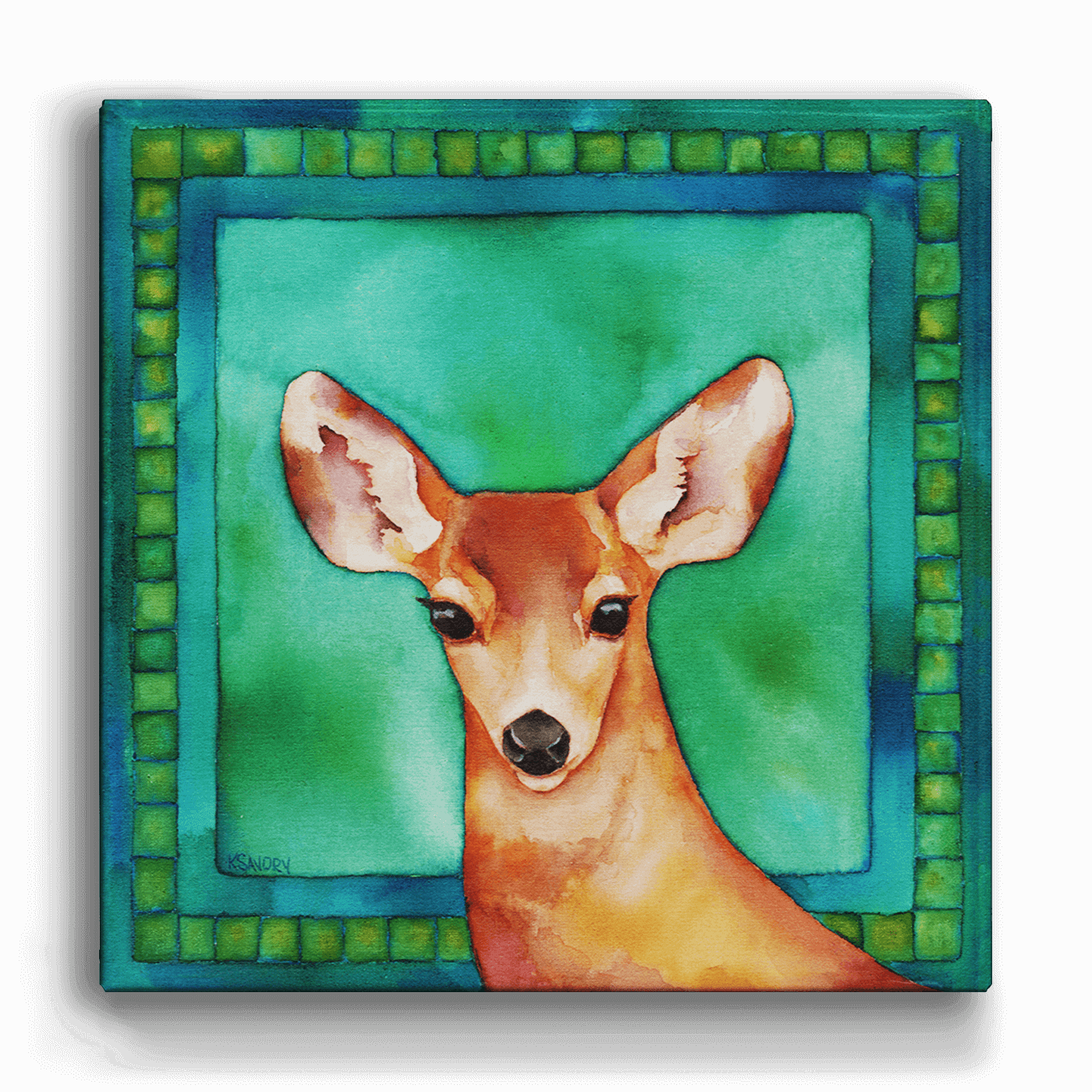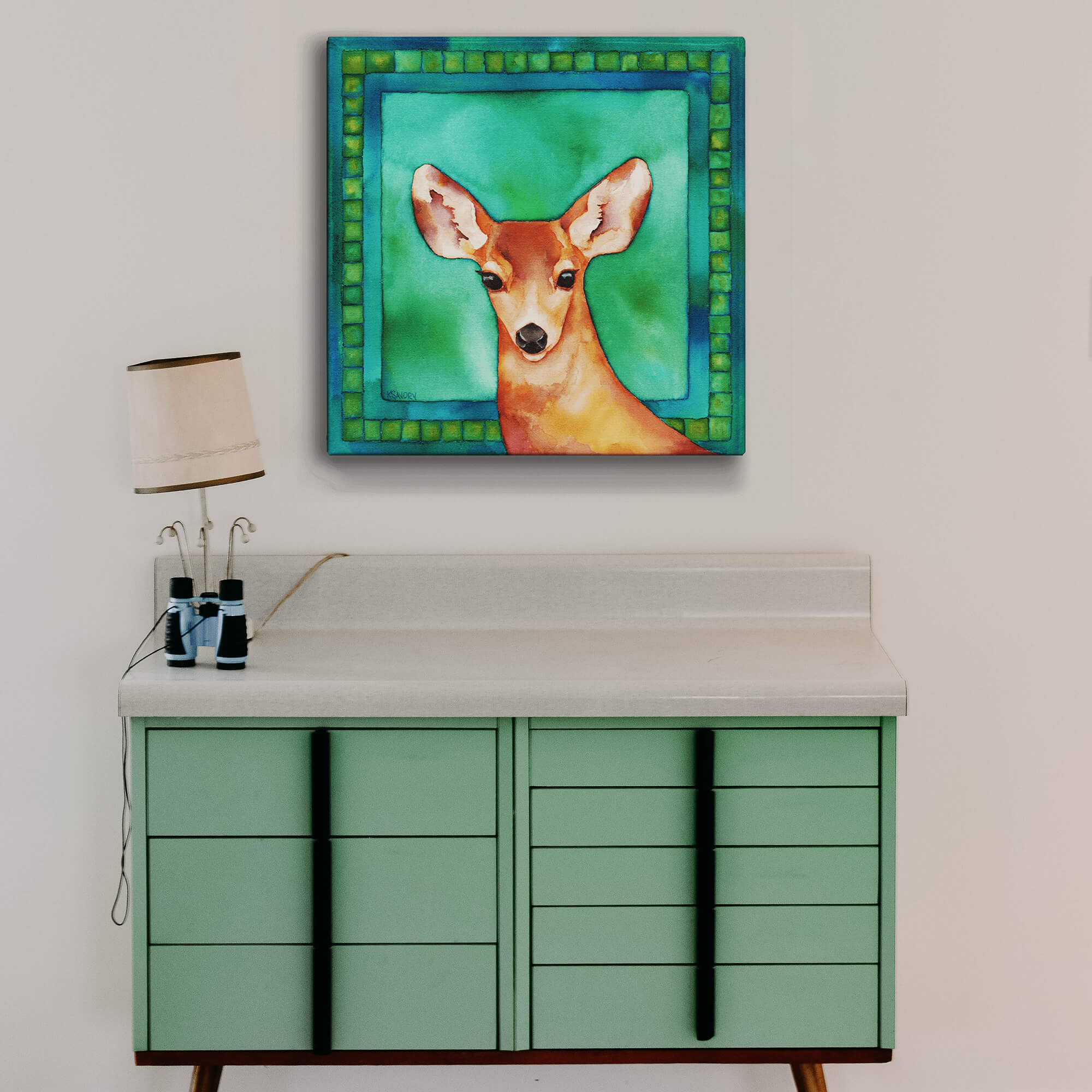 "Doe Eyes" beautifully captures the gentle and innocent gaze of a young deer, portrayed against a vibrant green backdrop framed by a stylized border. The rich color contrasts and the doe's expressive eyes draw the viewer into a moment of peaceful connection with nature. This piece combines the charm of wildlife art with a modern, artistic twist, making it a perfect addition to any home or office space.
