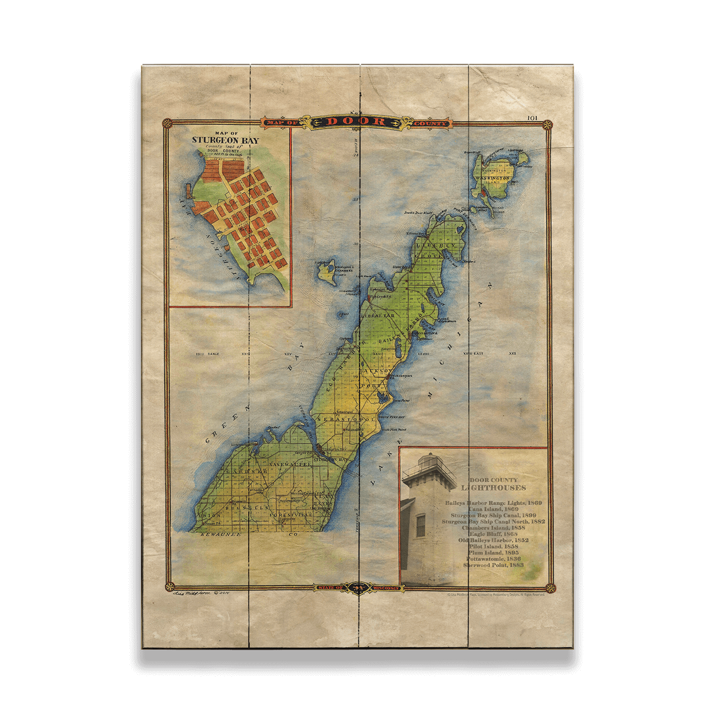 Immerse yourself in the historical allure of Door County, Wisconsin, with this meticulously detailed vintage-style map. This artwork showcases an elaborate depiction of Sturgeon Bay and the entire Door Peninsula, emphasizing its geographical beauty and nautical significance. The map is uniquely annotated with locations and founding dates of notable lighthouses like Baileys Harbor Range Light and Cana Island Light, reflecting the area’s rich maritime history.