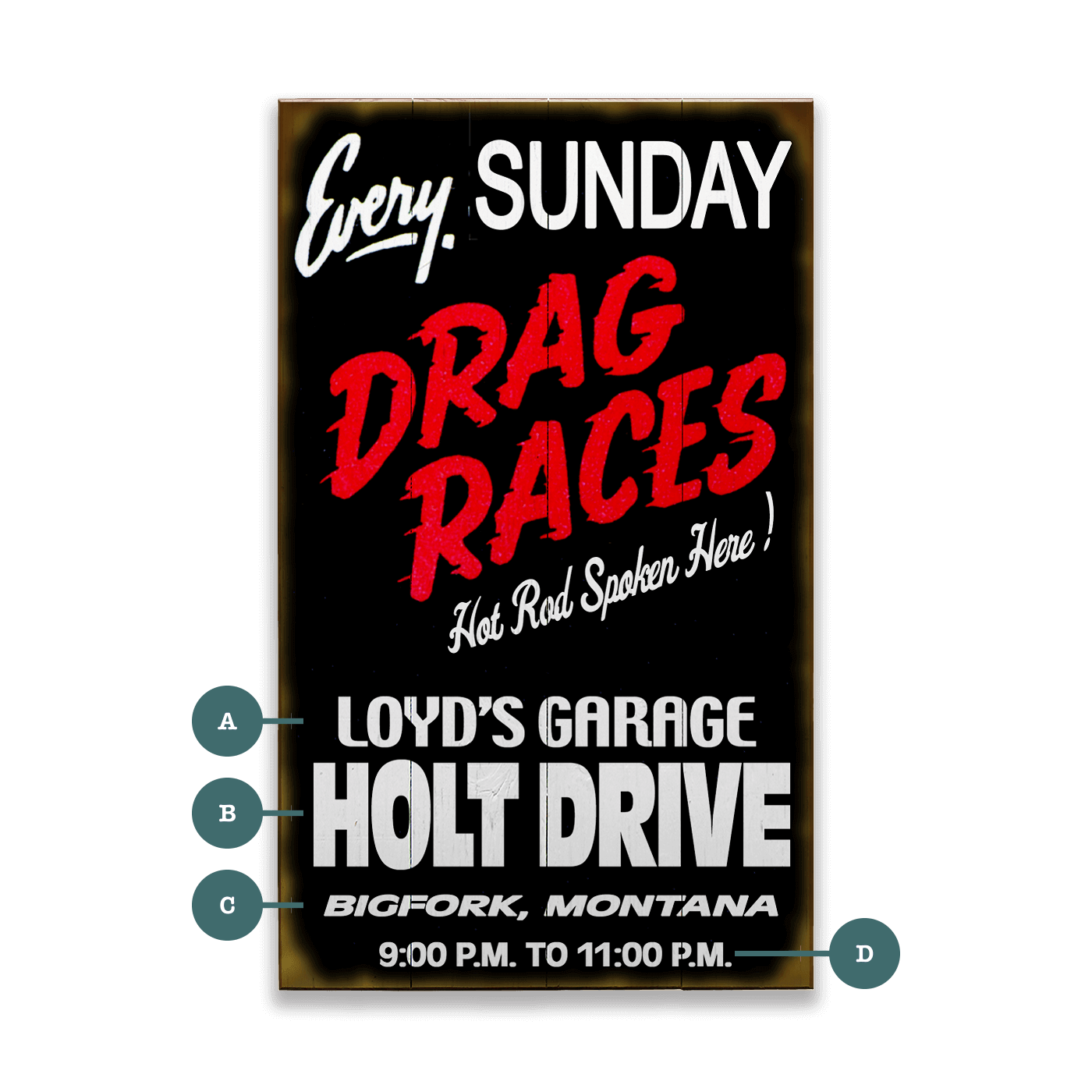 Enjoy complimentary personalization for this piece, meticulously handcrafted by our graphic design team. Specify your desired text for points A, B, C, and D. To ensure perfection in your custom piece, please verify your text carefully. Missing personalization information will revert to our default design as shown. To remove all text from a field, type "Remove" in that field.