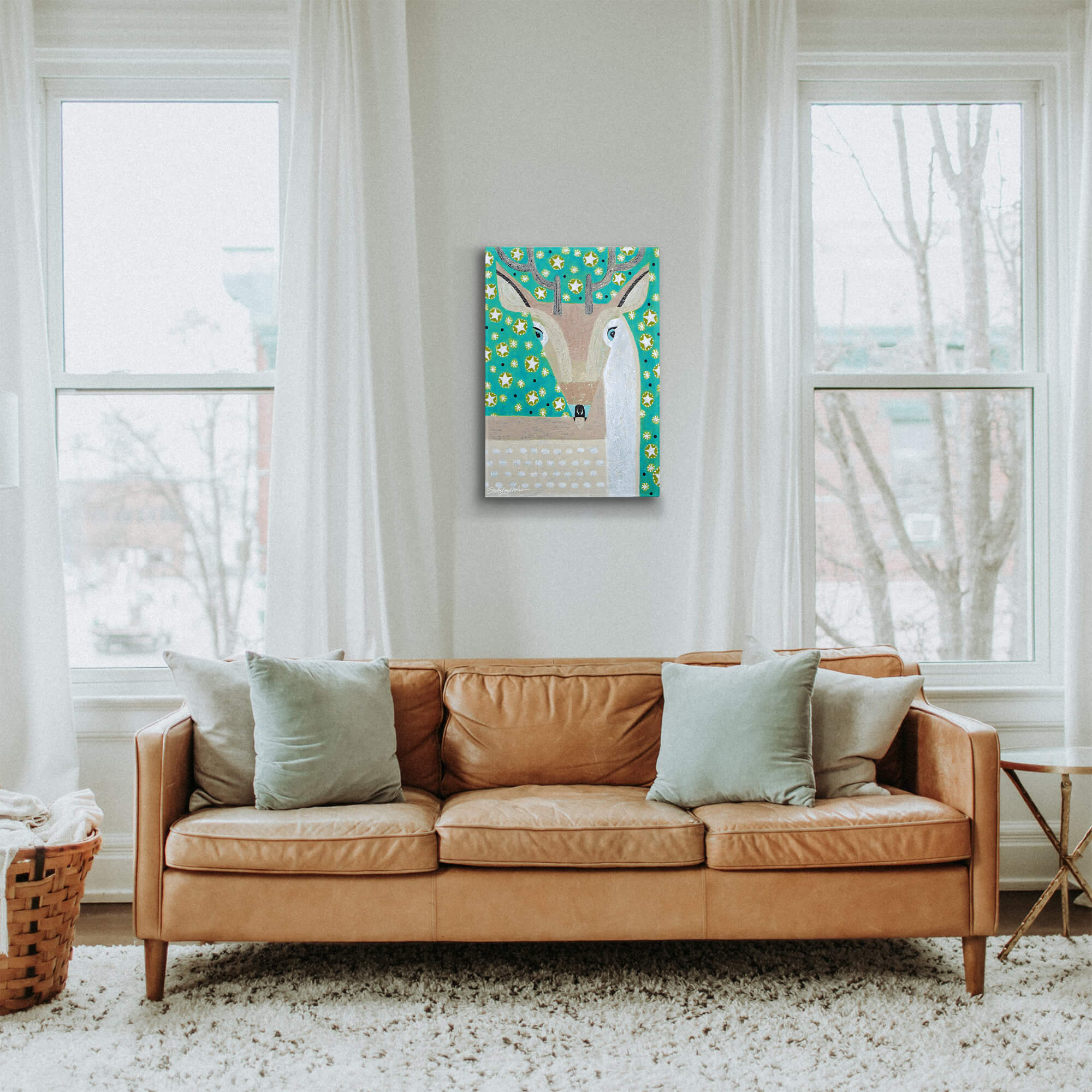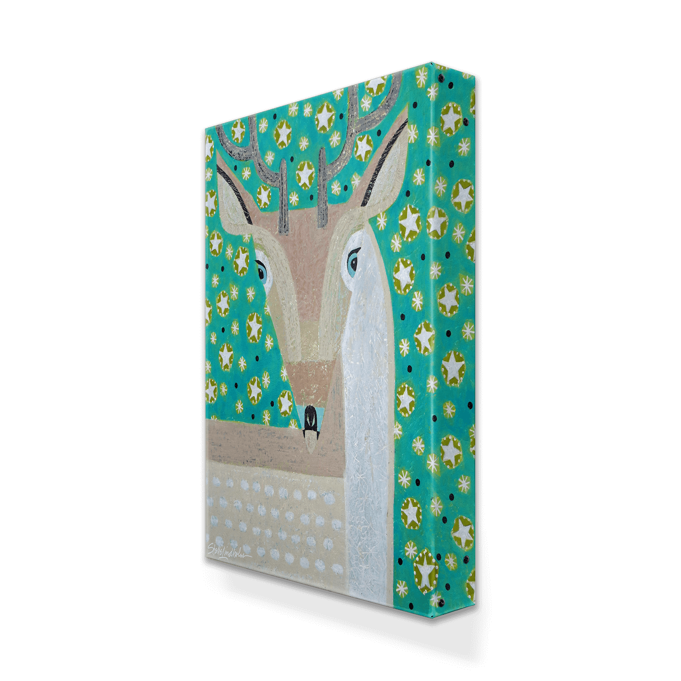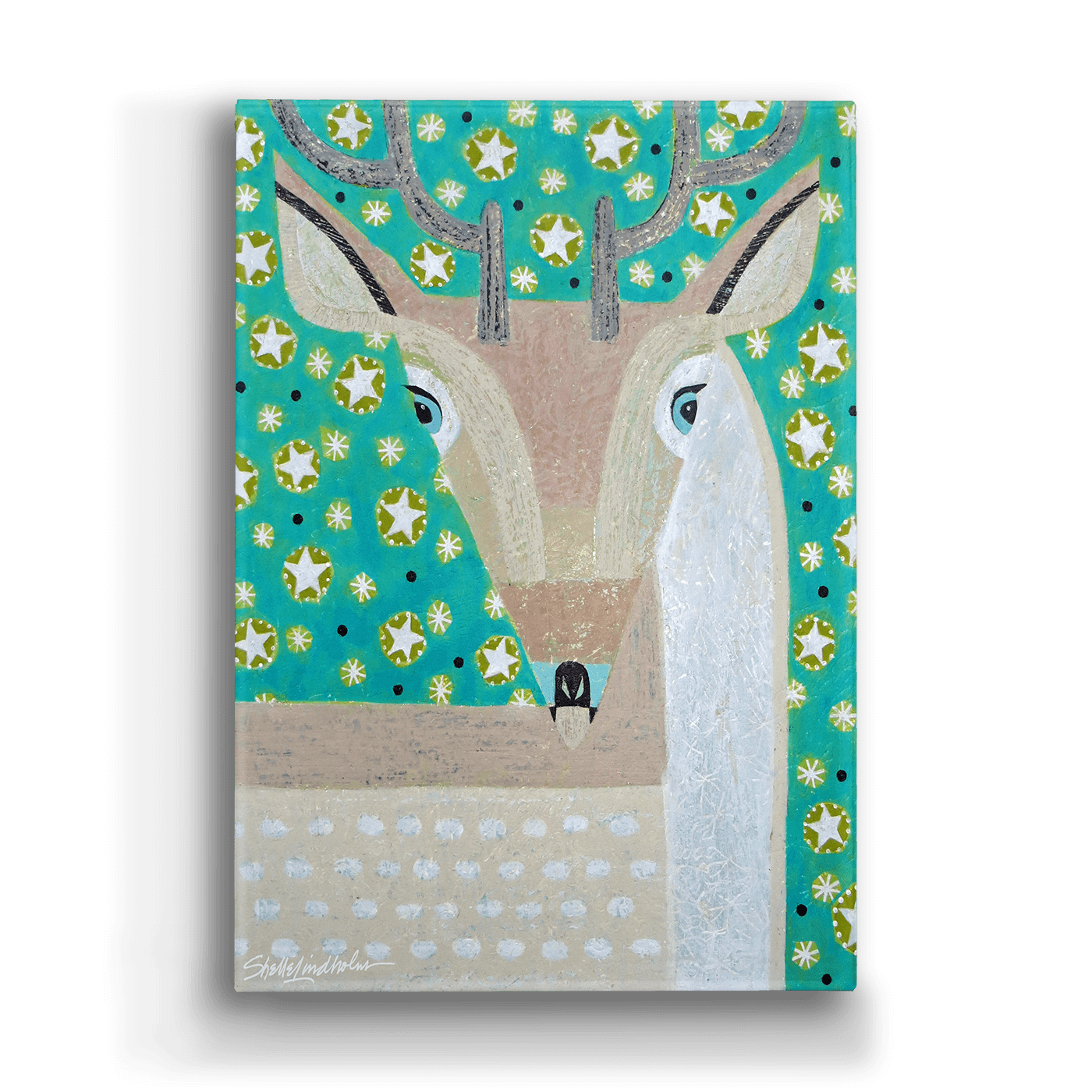 This eye-catching artwork features a serene deer with intricate antlers set against a patterned teal background adorned with stars and geometric shapes. The soft, muted tones of the deer beautifully contrast with the bold, playful background, creating a modern and whimsical feel. Perfect for nature lovers and those seeking a touch of creativity and elegance, this piece brings a blend of tranquility and charm to any room.
