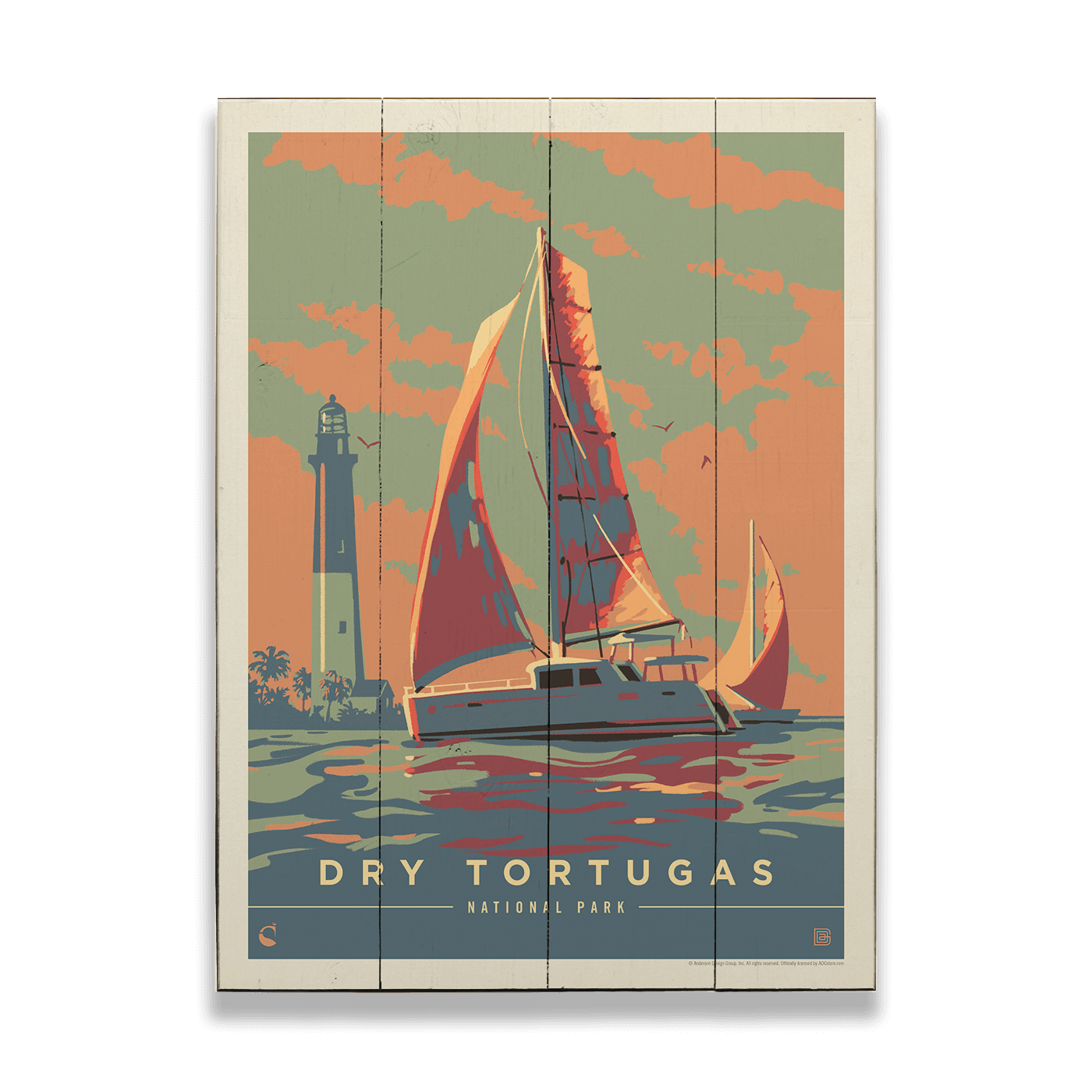 Set sail into a tropical dream with this vibrant artwork of Dry Tortugas National Park. A sailboat glides across shimmering waters under a sky painted in soft pastels, with a historic lighthouse rising in the background. Located 70 miles off the coast and accessible only by boat or seaplane, this remote paradise is known for its crystal-clear seas, coral reefs, and the iconic Fort Jefferson. This piece captures the freedom and serenity of an ocean escape, making it a perfect tribute to one of the most unique and secluded national parks in the U.S.
