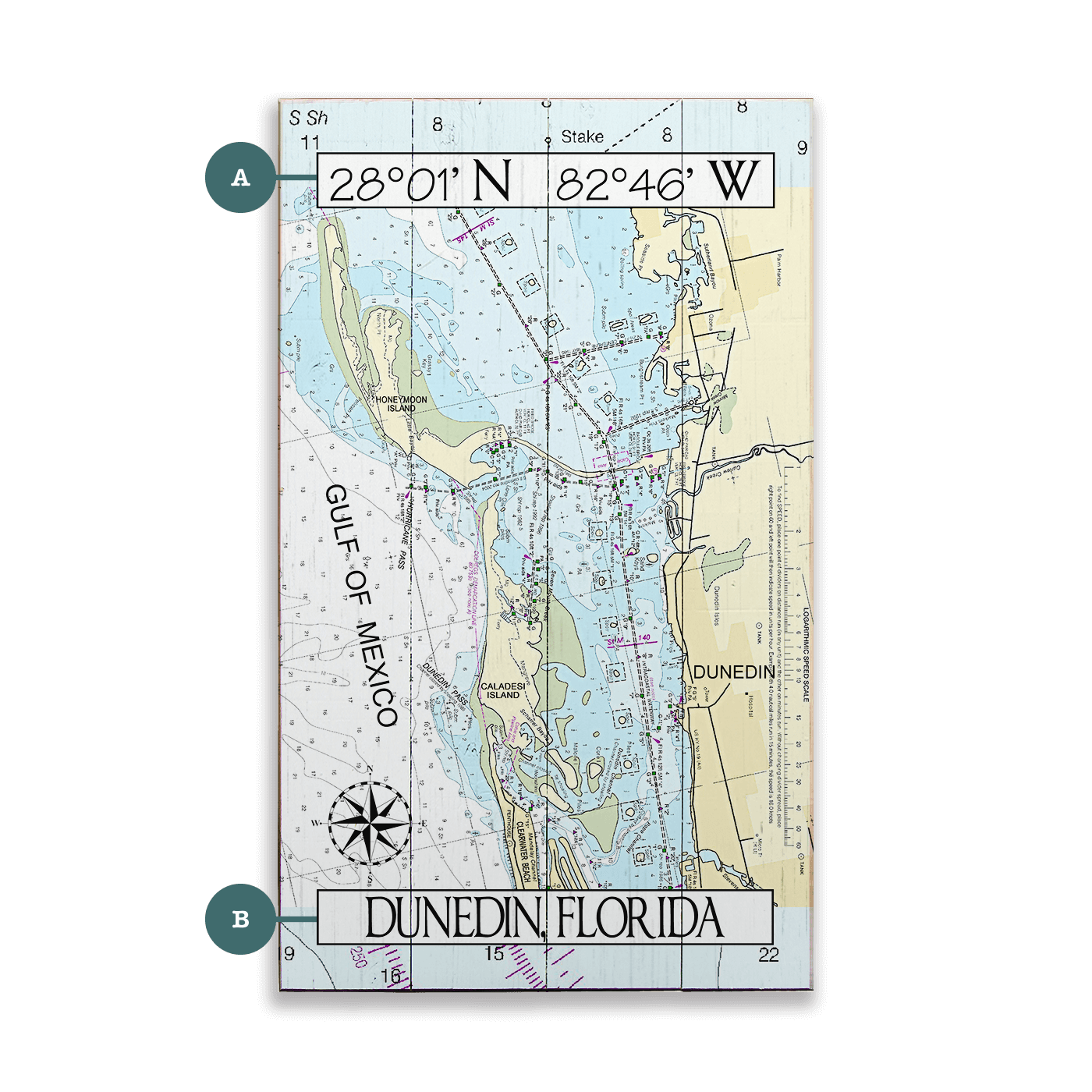 This artwork highlights a detailed chart of Dunedin, Florida, featuring the coastal landscape along with the coordinates (28°01' N, 82°46' W) and a decorative compass rose. The name and coordinates can be customized, making it a perfect personalized piece for anyone with a connection to this charming Gulf Coast town. Ideal for coastal-themed decor, this artwork beautifully captures the essence of Dunedin and adds a unique touch to any space.