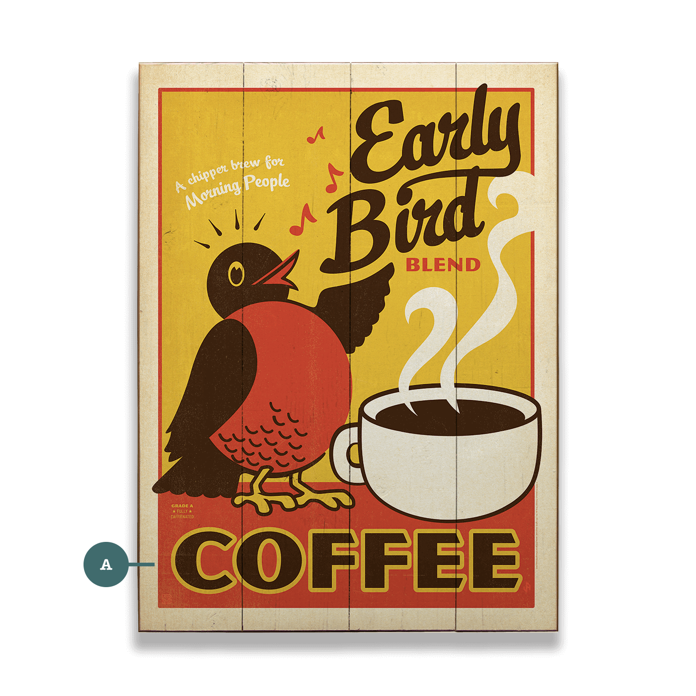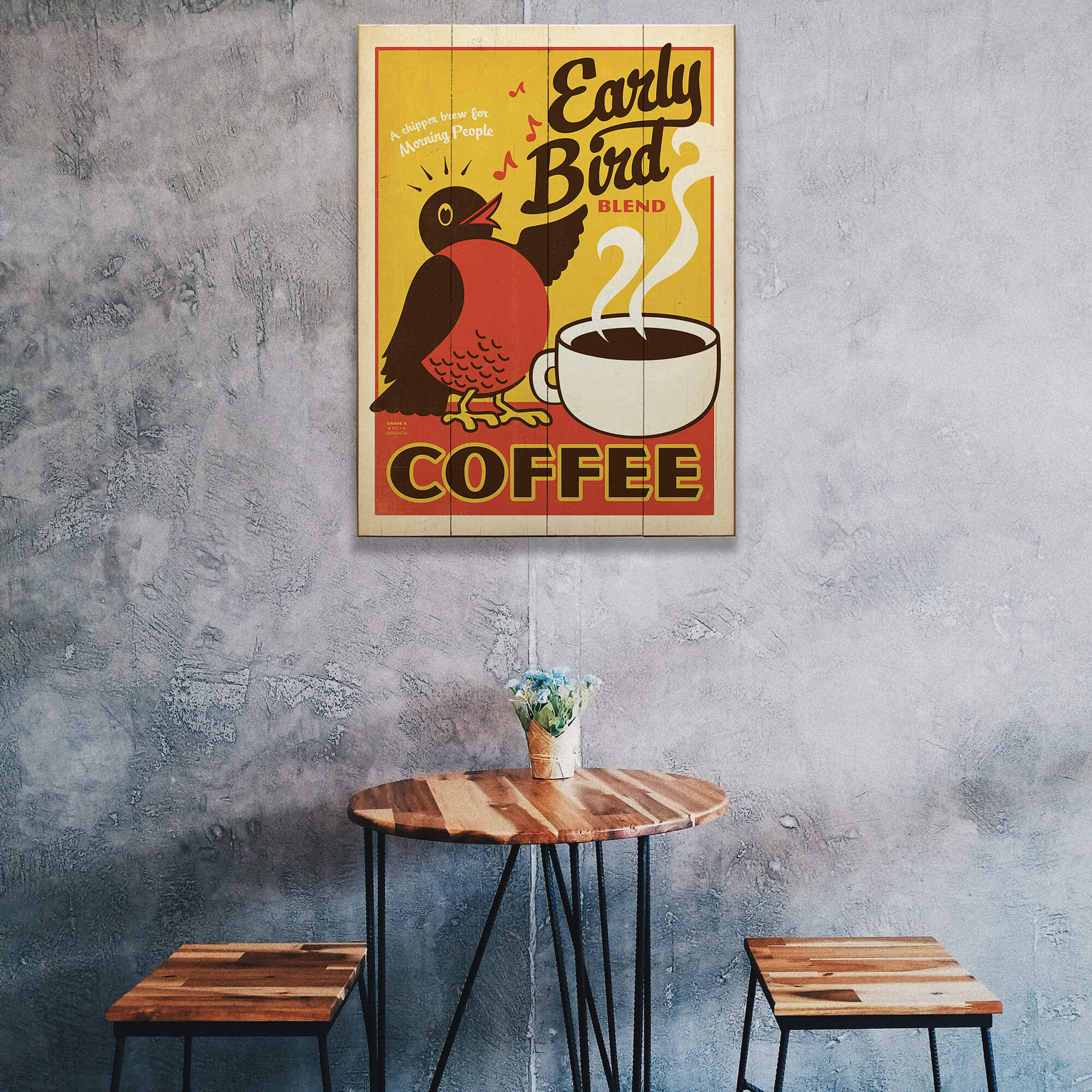 Kick-start your mornings with the 'Early Bird Coffee' print, a vibrant tribute to the morning's first cup. This playful artwork, with its bright colors and engaging design, features a cheerful bird eagerly announcing the start of a new day. Described as "a chipper brew for Morning People," this print is a delightful addition to any kitchen, café, or office space, perfect for coffee lovers who thrive with the rise of the sun.