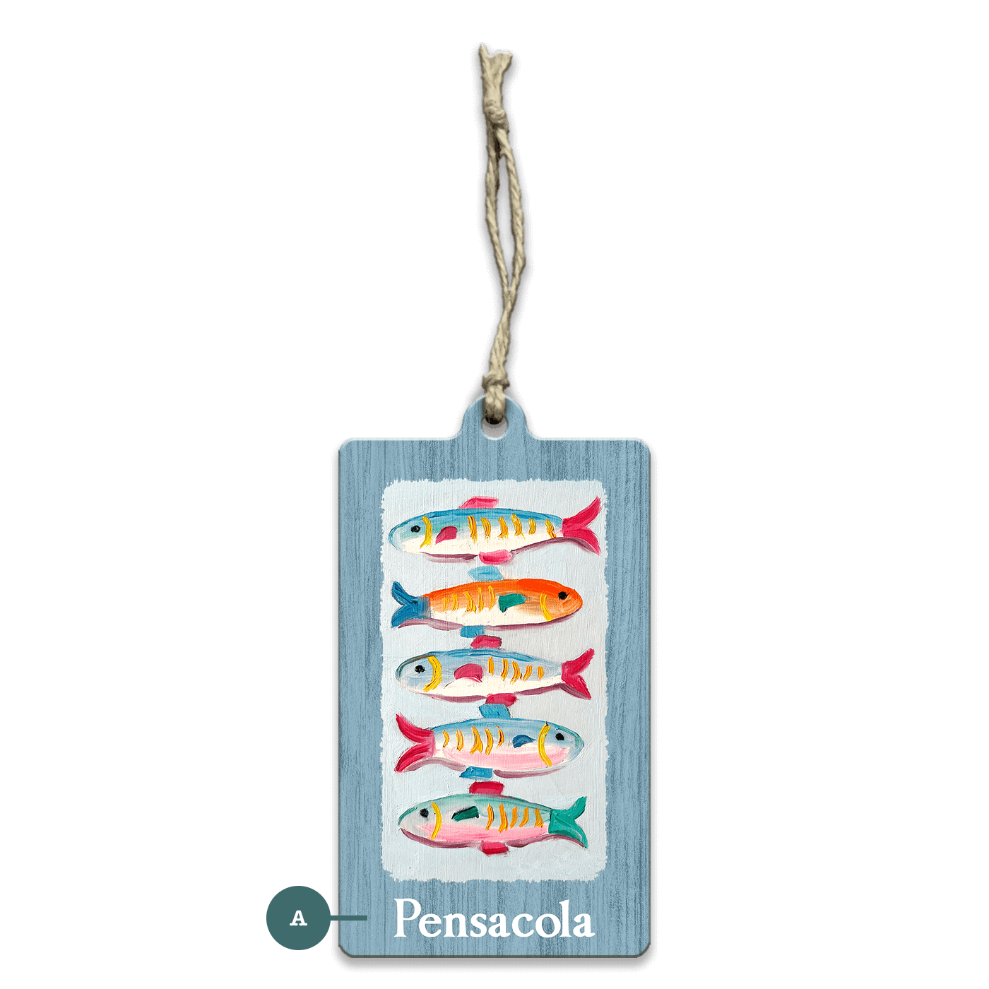 Bright, bold, and full of character, this artwork features a vertical lineup of five whimsically painted fish. The brushstroke-style texture and weathered blue wooden background evoke a laid-back coastal aesthetic that fits right in with breezy beach cottages and cheerful seafood shacks. Whether you're decorating a guest room, porch, or vacation rental, this piece adds a fun and lighthearted touch that captures the spirit of coastal living.