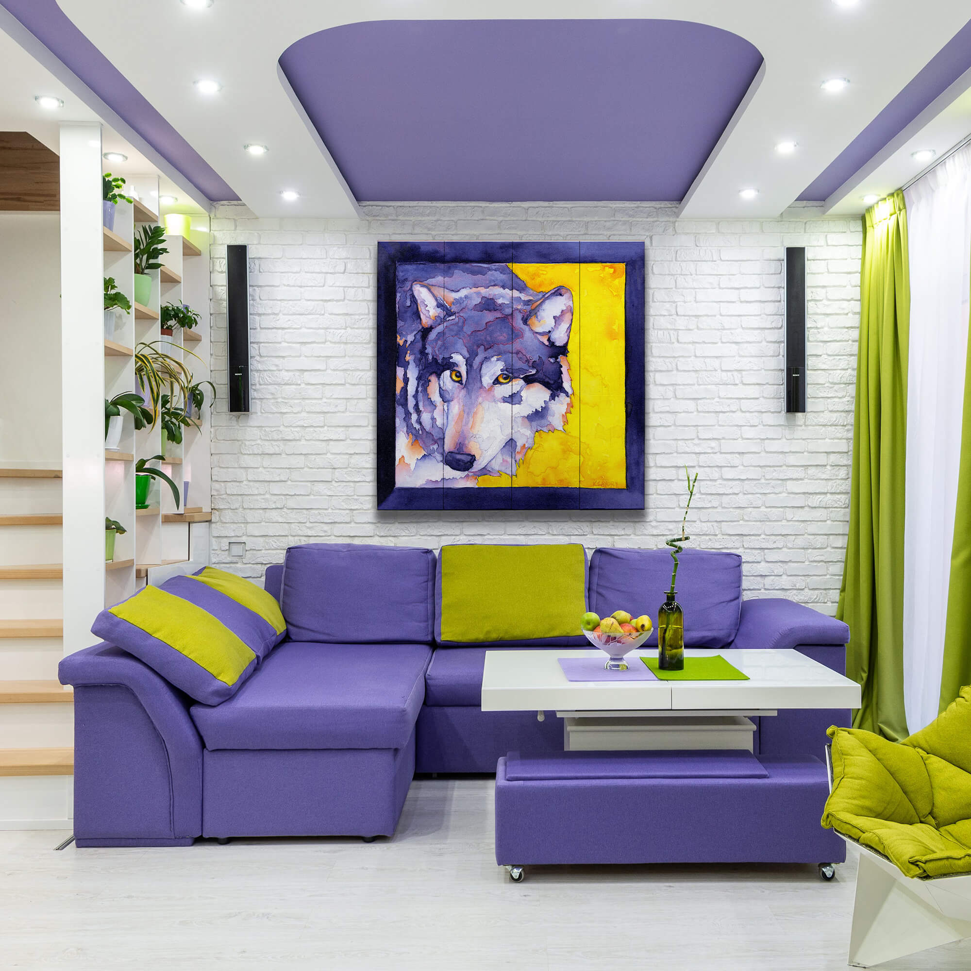 This compelling artwork captures the intense and mysterious gaze of a wolf, depicted with a masterful blend of colors ranging from deep blues and grays to a vivid yellow background. This painting vividly portrays the wolf's wild and untamed nature, reflecting its status as a symbol of both beauty and peril in the natural world. The striking contrast between the warm background and the cool tones of the wolf’s fur enhances the visual impact of the piece. This artwork is perfect for those who are captivated by the raw, majestic presence of wildlife, offering a powerful and thought-provoking addition to any art collection.