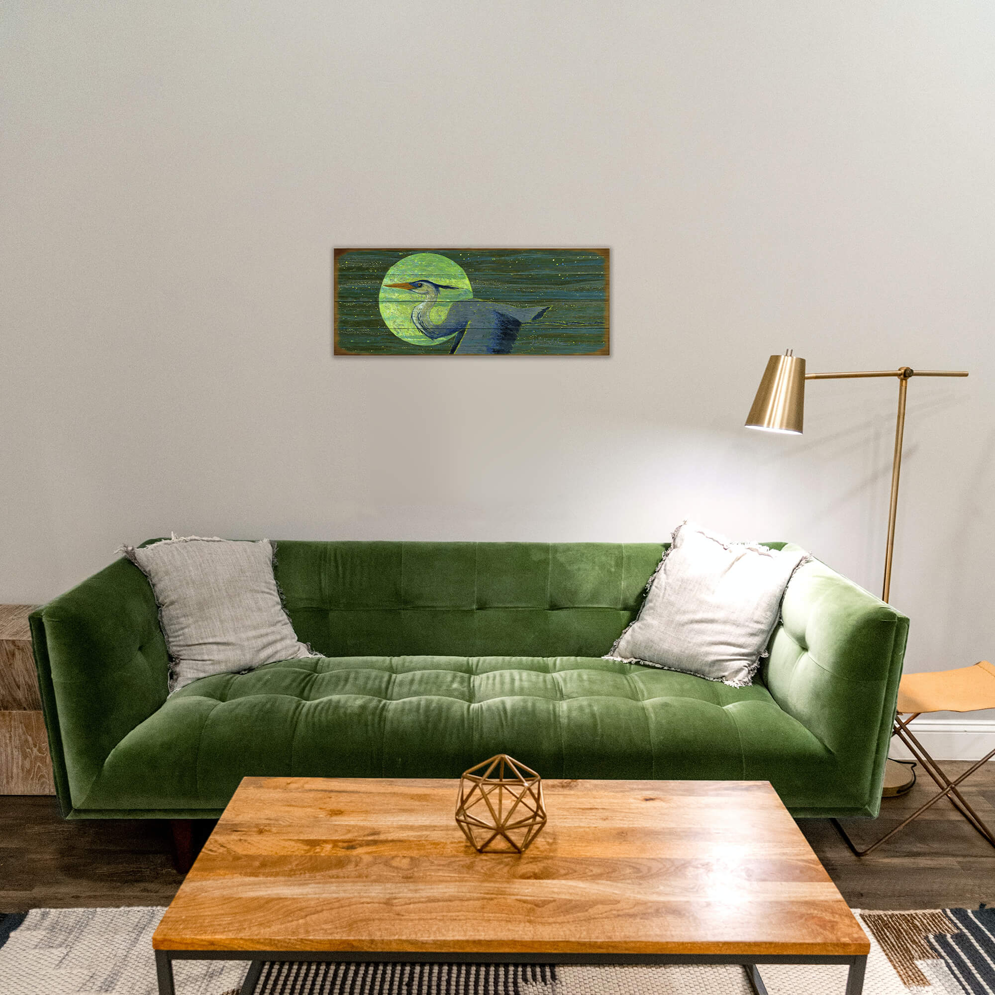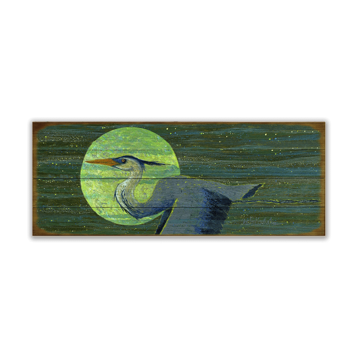 This enchanting artwork features a majestic blue heron gliding gracefully through a green and blue night sky, illuminated by the glow of a vibrant full moon. The rich textures and ethereal palette create a dreamlike celebration of nature's beauty and mystery. Perfect for those who appreciate tranquil, evocative art, this piece brings a sense of calm and wonder to any space, making it an exquisite addition to your collection.