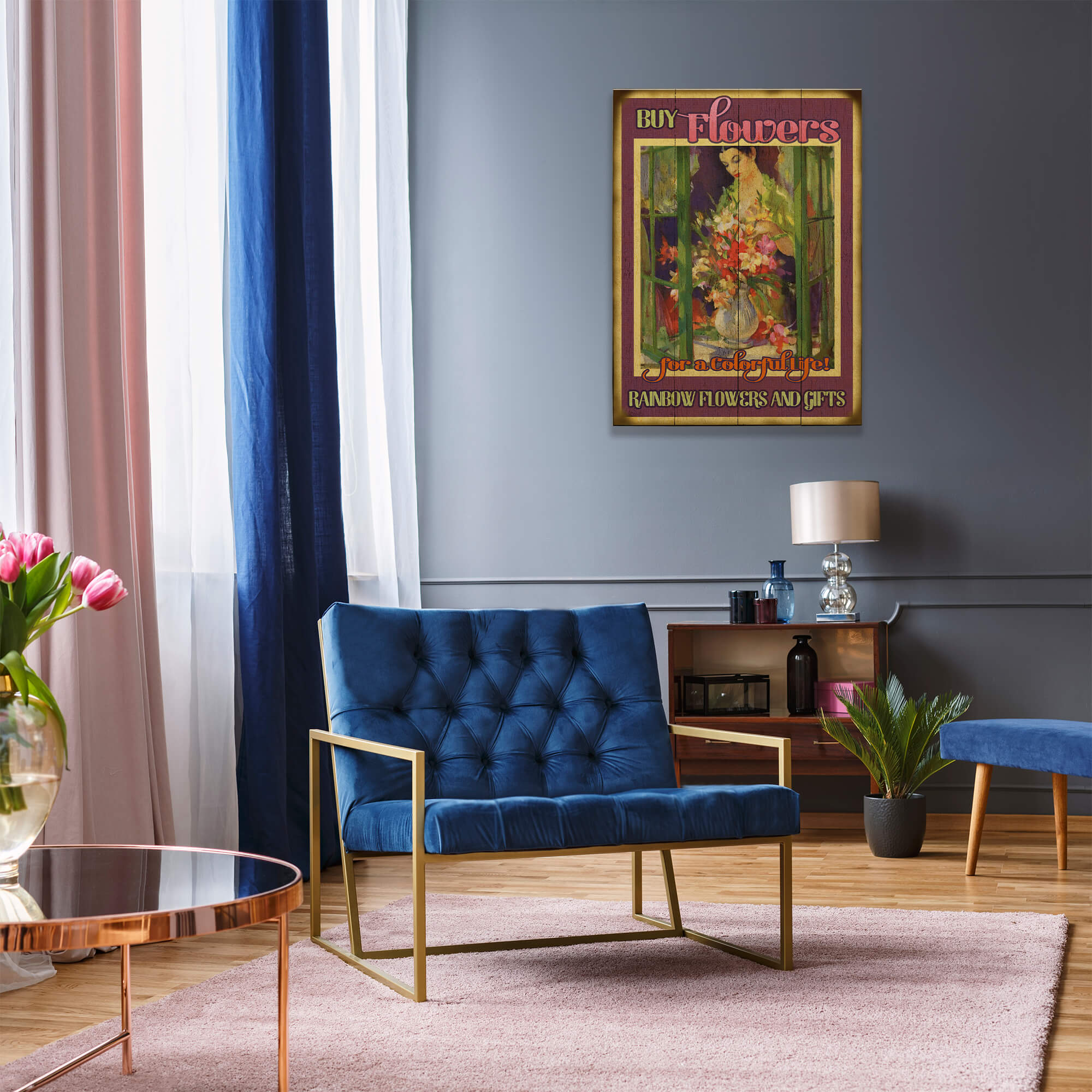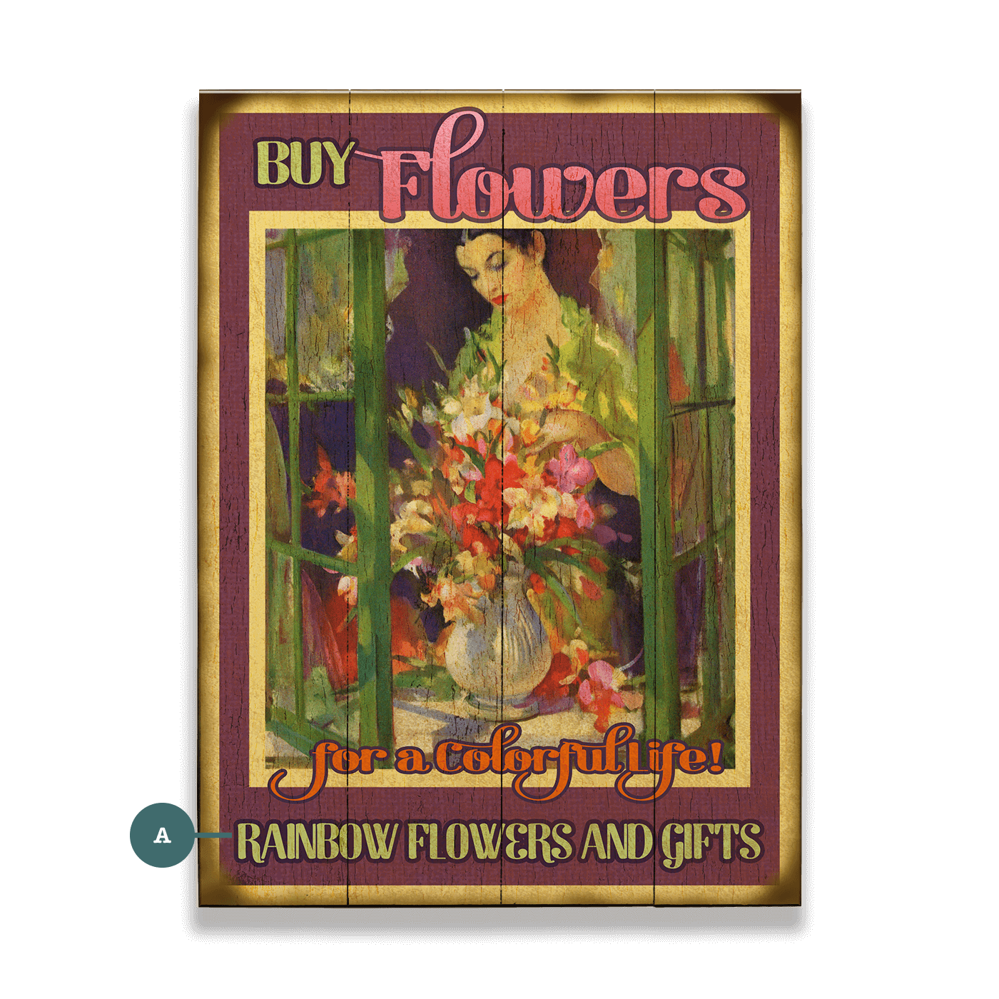 Bursting with color and charm, this piece captures the timeless beauty of fresh flowers and their ability to brighten any space. A graceful woman arranges a lush bouquet by an open window, surrounded by warm sunlight and rich, painterly textures. The vibrant floral hues contrast beautifully with deep, vintage-inspired tones, evoking the nostalgic feel of classic flower shop signage. With its elegant lettering and rustic appeal, this artwork is perfect for florists, garden lovers, or anyone who enjoys the uplifting presence of fresh blooms in everyday life. A delightful reminder that flowers bring joy, warmth, and a touch of artistry to any setting.