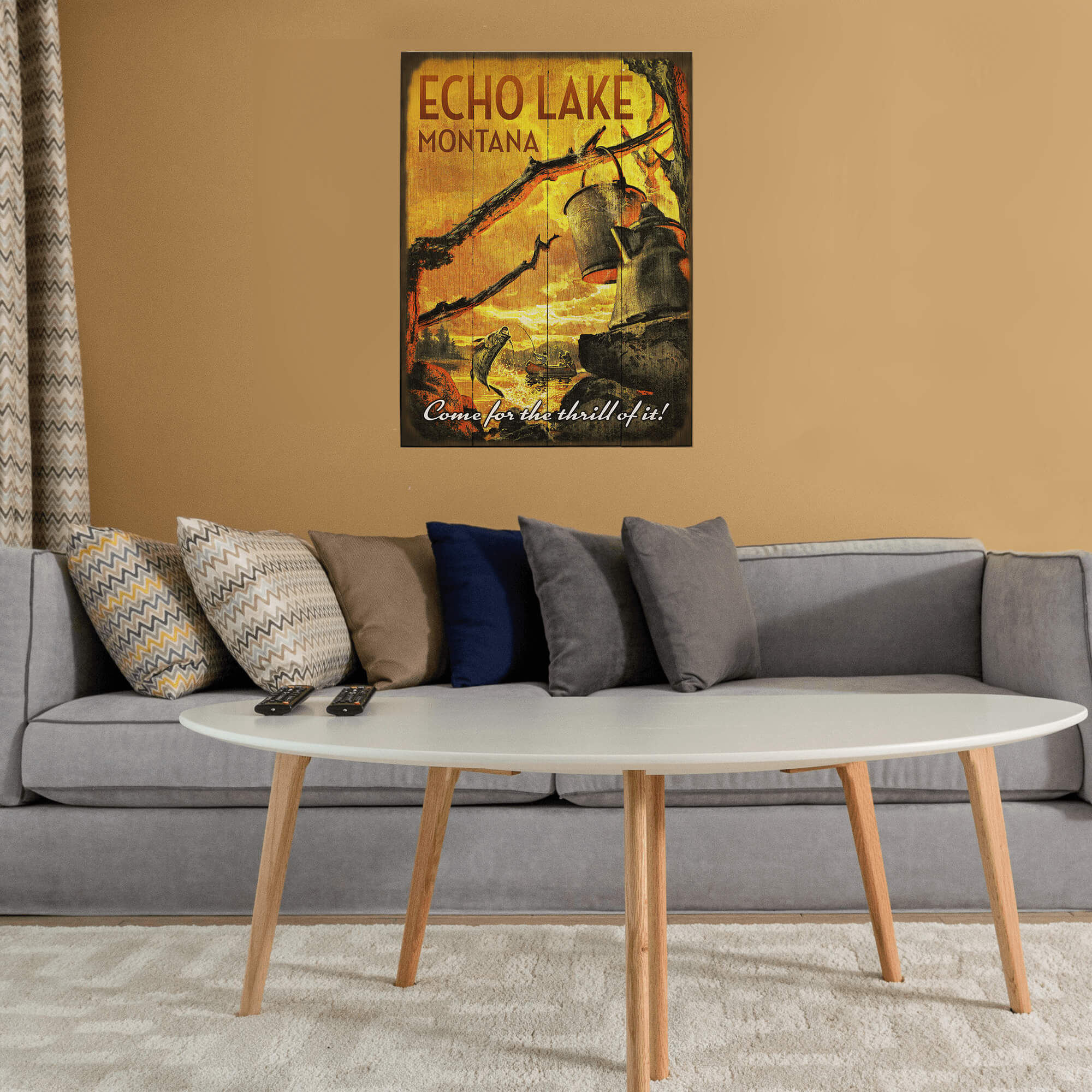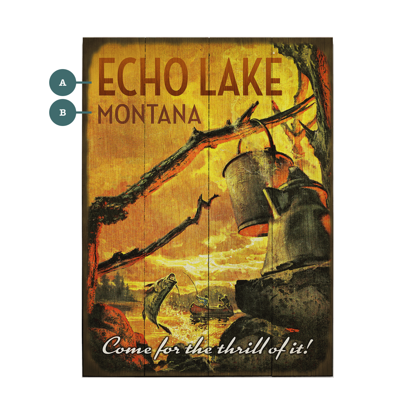 Featuring a dramatic scene of a man in a canoe battling to reel in a fish that is leaping out of the water, this piece invites you to experience the thrill of nature. The rich, warm colors and detailed illustration evoke a sense of nostalgia and excitement, making it a perfect addition to any space. Ideal for cabins, lodges, or rustic-themed decor, this artwork celebrates the joy and intensity of outdoor adventures.