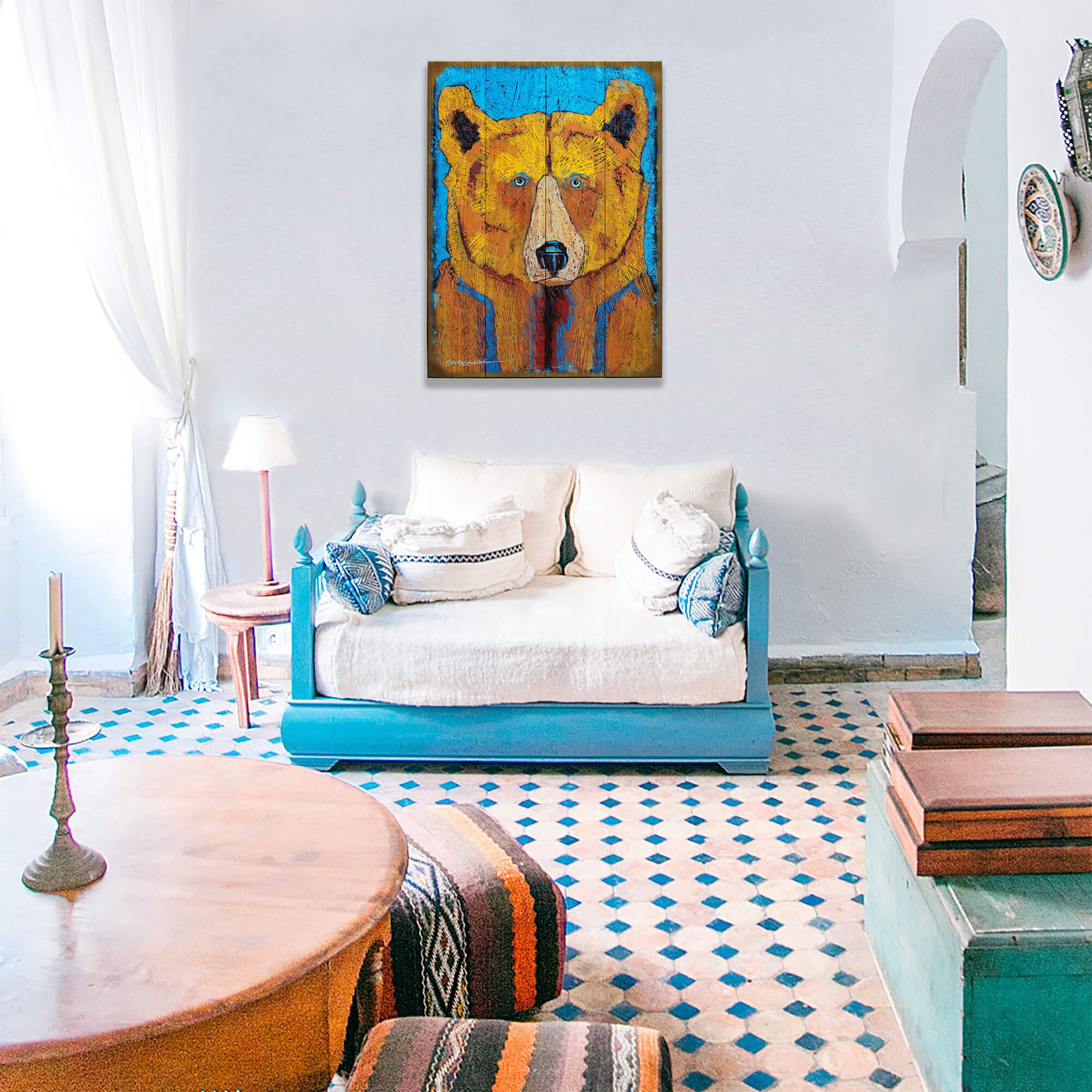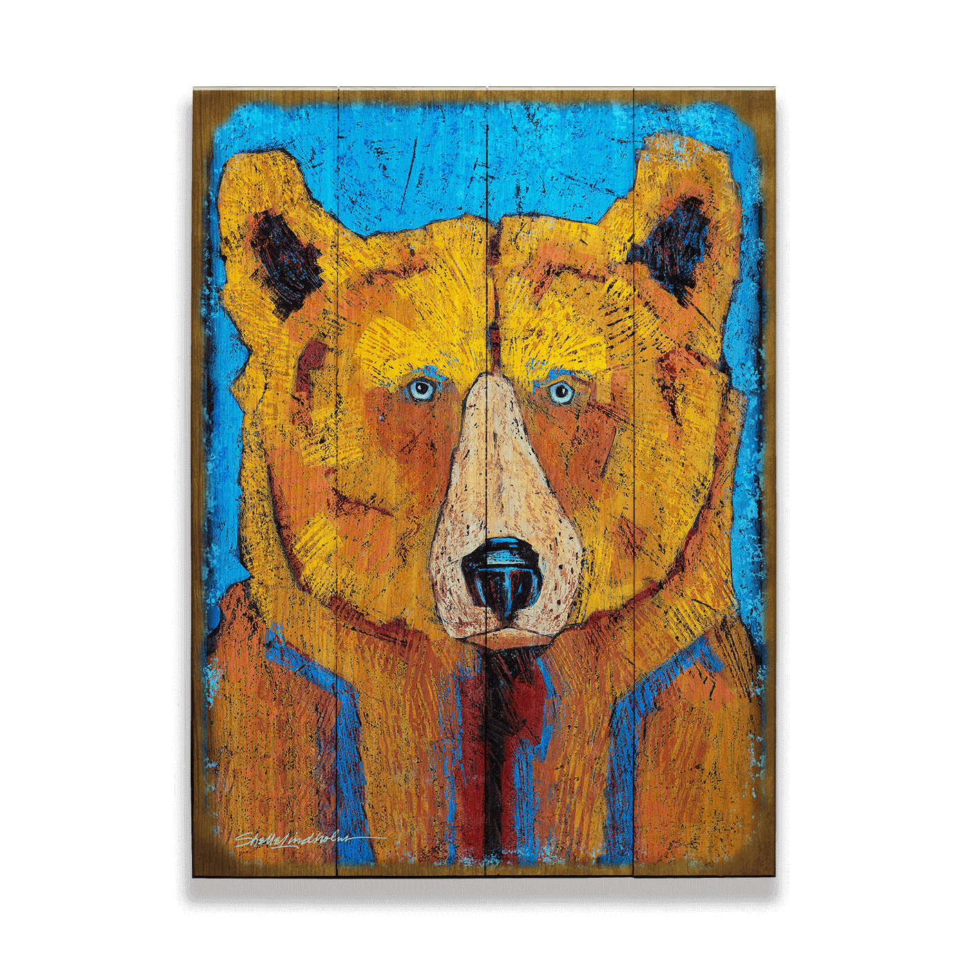 "Freckles" is an enchanting portrait of a bear that captures the spirit of its subject through the imaginative use of color and detail. The bear's face is depicted in warm, golden tones with touches of blue and textured brushstrokes that suggest a playful yet wise demeanor, much like freckles on a face. This artwork's compelling gaze and vivid colors create a lifelike presence that enhances any space. Perfect for art enthusiasts who appreciate pieces that convey character and emotion, "Freckles" adds a unique and personal touch to both modern and rustic interiors.