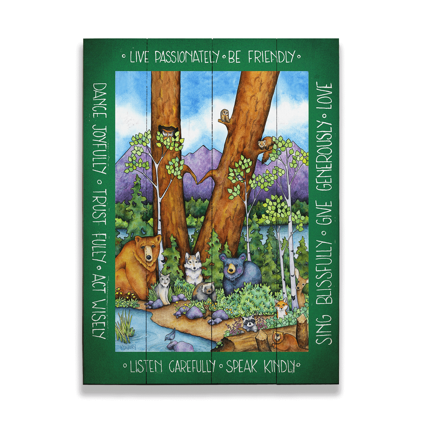 Bring the forest to life with a charming gathering of woodland creatures, including a bear, wolf, owl, and more, nestled among tall trees and vibrant greenery. The scene captures a spirit of harmony and joy, with each animal adding unique personality to the peaceful setting. Surrounded by uplifting phrases, this piece serves as a reminder to live mindfully and embrace kindness. Perfect for nature lovers and those who cherish wildlife, this artwork radiates warmth and community, making it a wonderful addition to any space seeking a touch of natural beauty and inspiration.