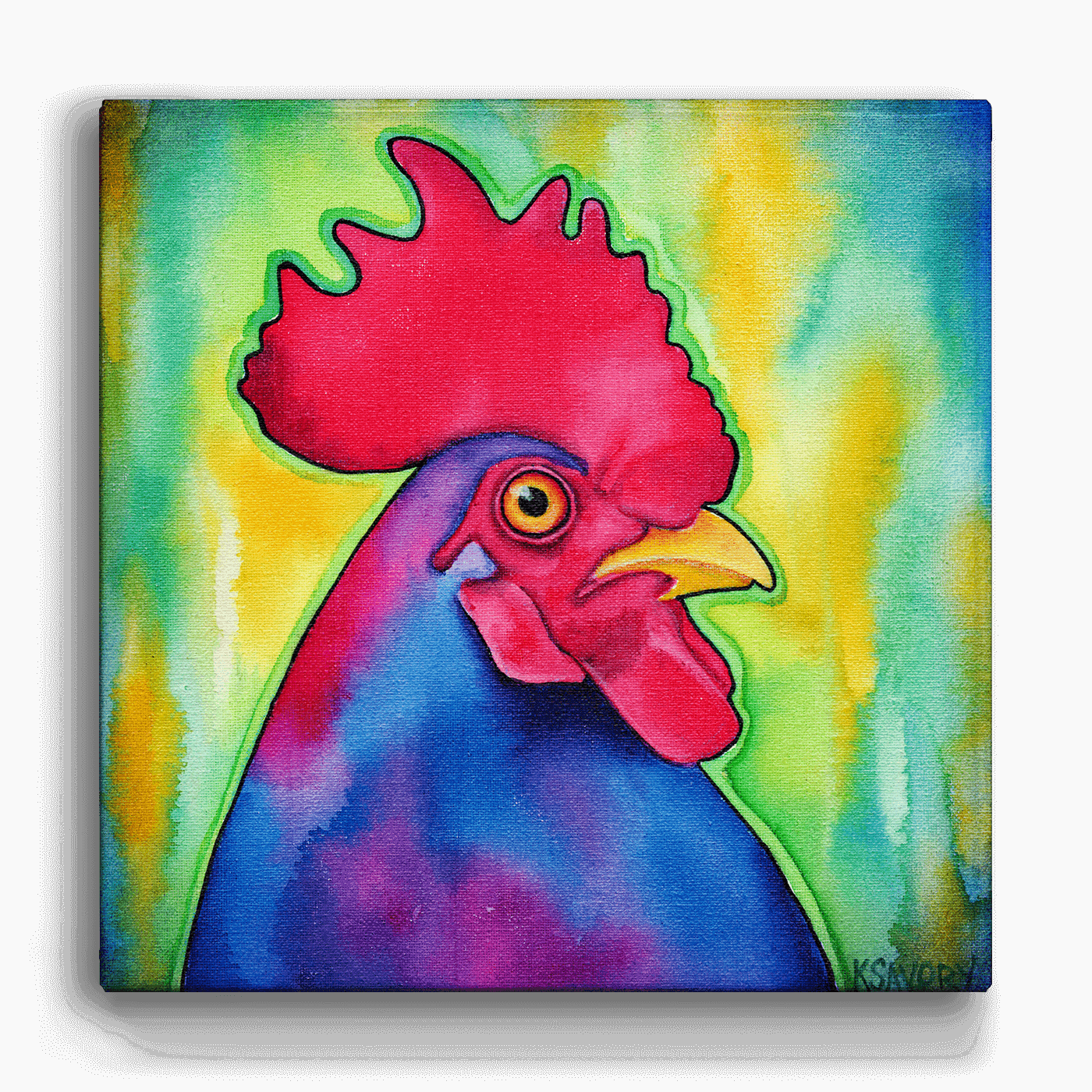 "George" is an eye-catching and vibrant portrayal of a rooster, depicted with a kaleidoscope of bright colors against a lively green and yellow background. The artwork brilliantly captures the spirited and bold nature of the rooster, with its striking red comb and deep blue feathers, emphasizing its commanding presence. This piece is perfect for adding a splash of color and energy to any space, making it a standout addition for those who appreciate art that is both lively and expressive. Ideal for kitchens, dining rooms, or any area that benefits from a touch of whimsical charm and vivid imagery.