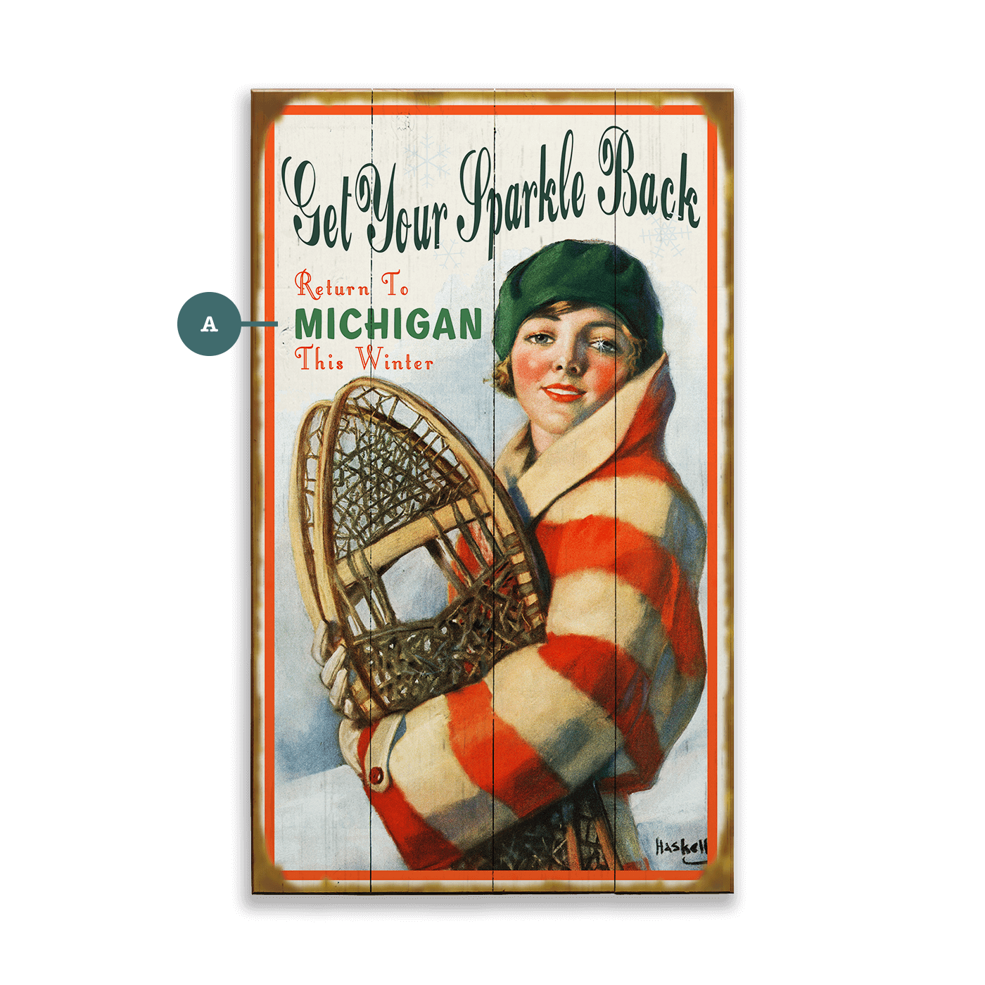 Rediscover winter wonder with our 'Get Your Sparkle Back' vintage print. Featuring a cheerful woman clad in vibrant winter attire, complete with snowshoes, this artwork evokes the joy and excitement of the snowy season. Perfect for those who appreciate nostalgic art or are looking to celebrate rich winter traditions, this piece adds a warm, inviting touch to any room.