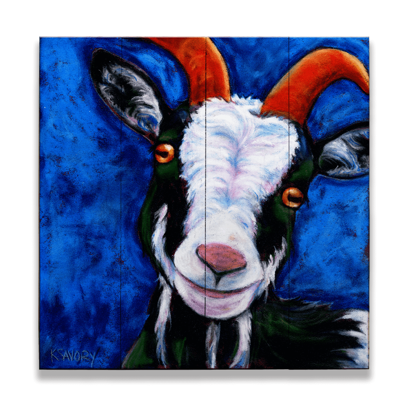 This vibrant goat artwork captures the playful charm and personality of the animal with bold colors and expressive details. The deep blue background contrasts with the goat’s warm orange horns and lively eyes, giving the piece a captivating and whimsical energy. Perfect for adding a pop of color and character to any space, this painting brings a joyful and lively touch to animal art lovers and fans of unique, colorful decor.