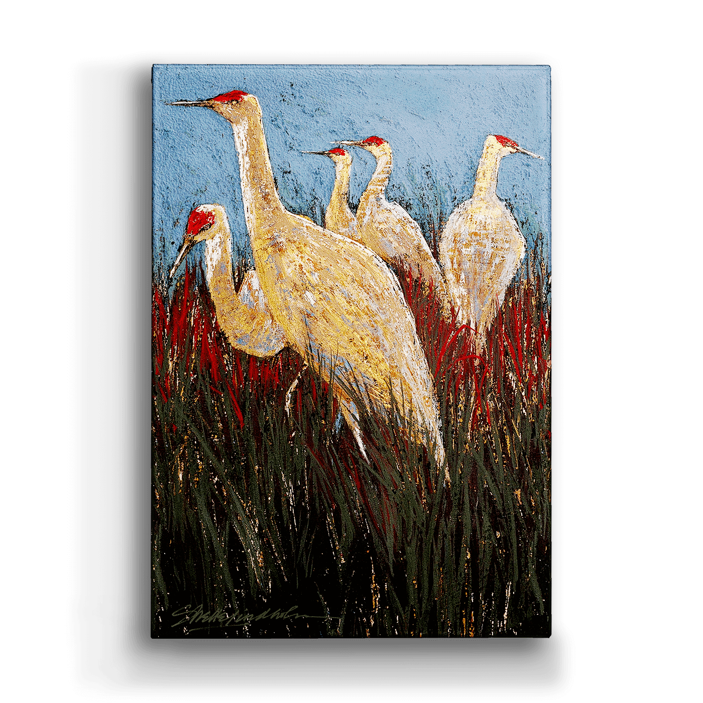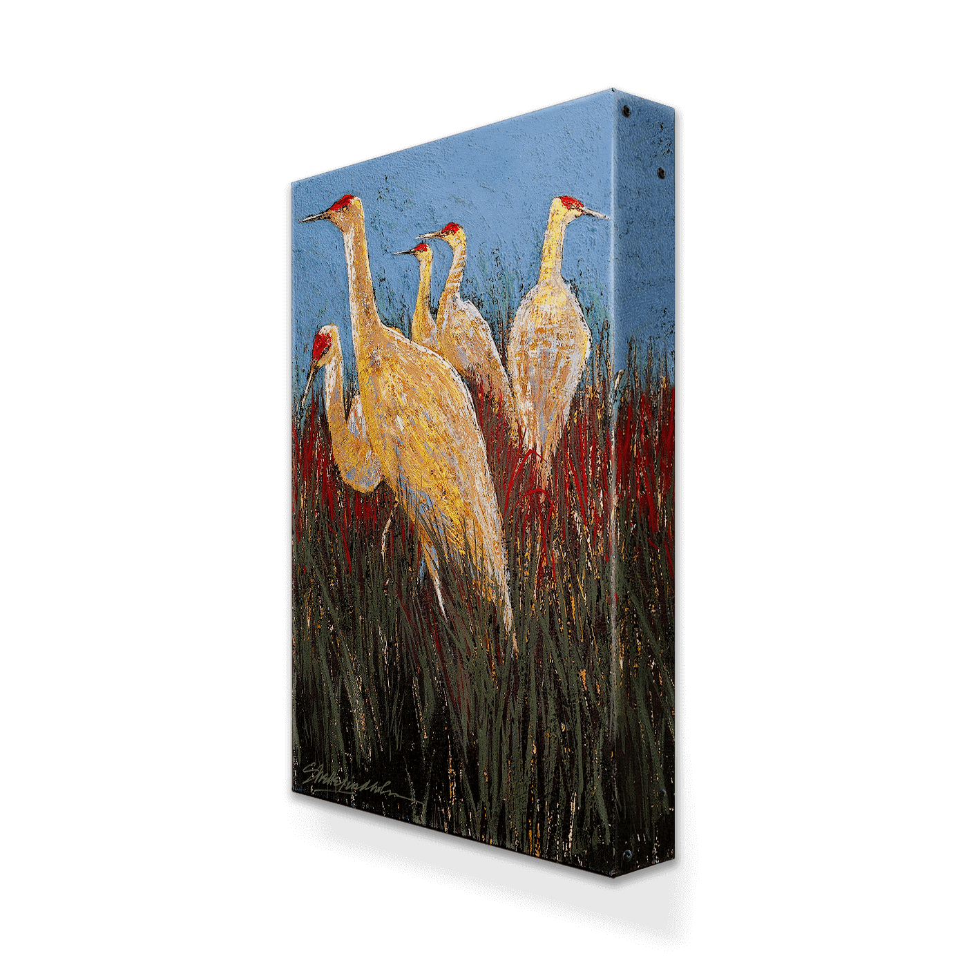 Add a touch of elegance to your decor with this graceful artwork featuring cranes amidst tall marsh grasses. The soft blue background and earthy red and gold tones create a serene yet vibrant composition that captures the beauty of nature. Perfect for creating a calming focal point, this piece brings sophistication and warmth to any space.