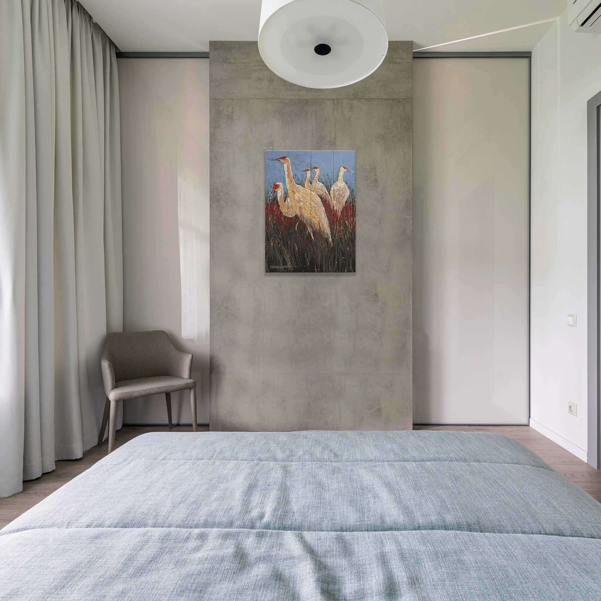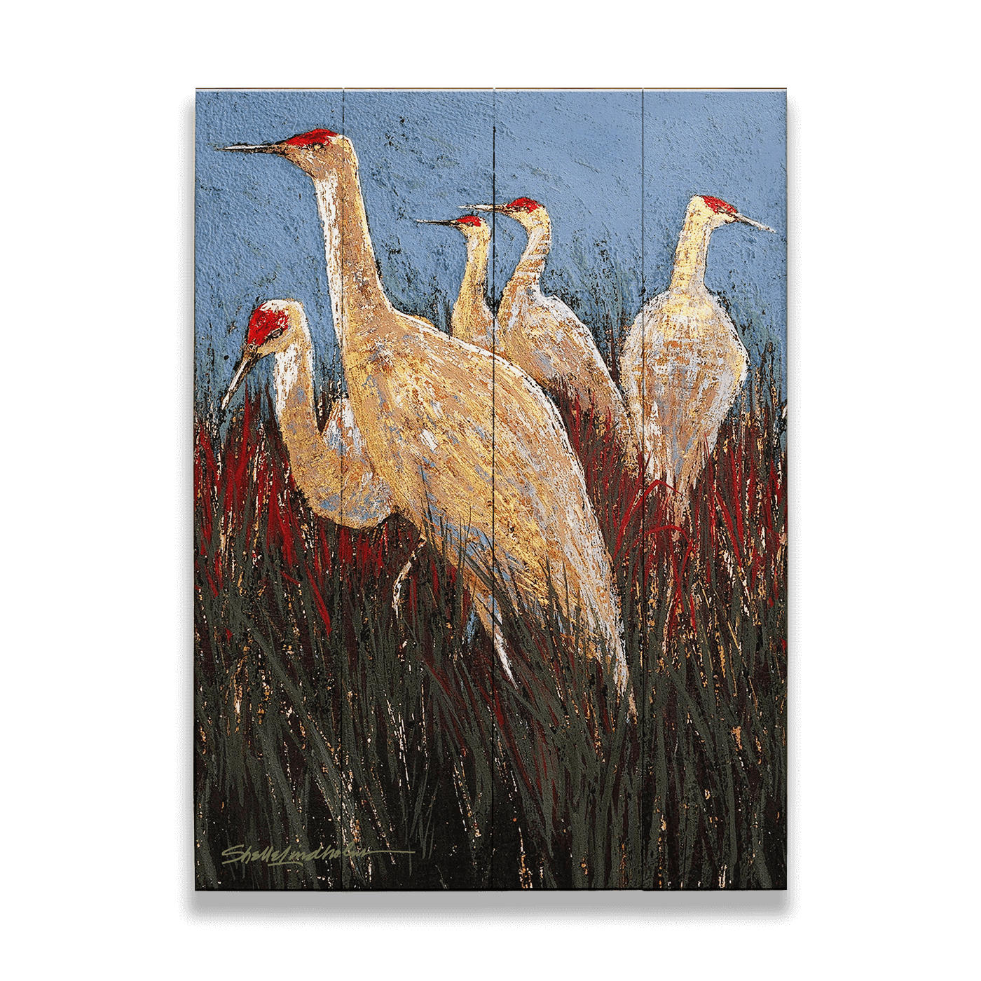 Add a touch of elegance to your decor with this graceful artwork featuring cranes amidst tall marsh grasses. The soft blue background and earthy red and gold tones create a serene yet vibrant composition that captures the beauty of nature. Perfect for creating a calming focal point, this piece brings sophistication and warmth to any space.