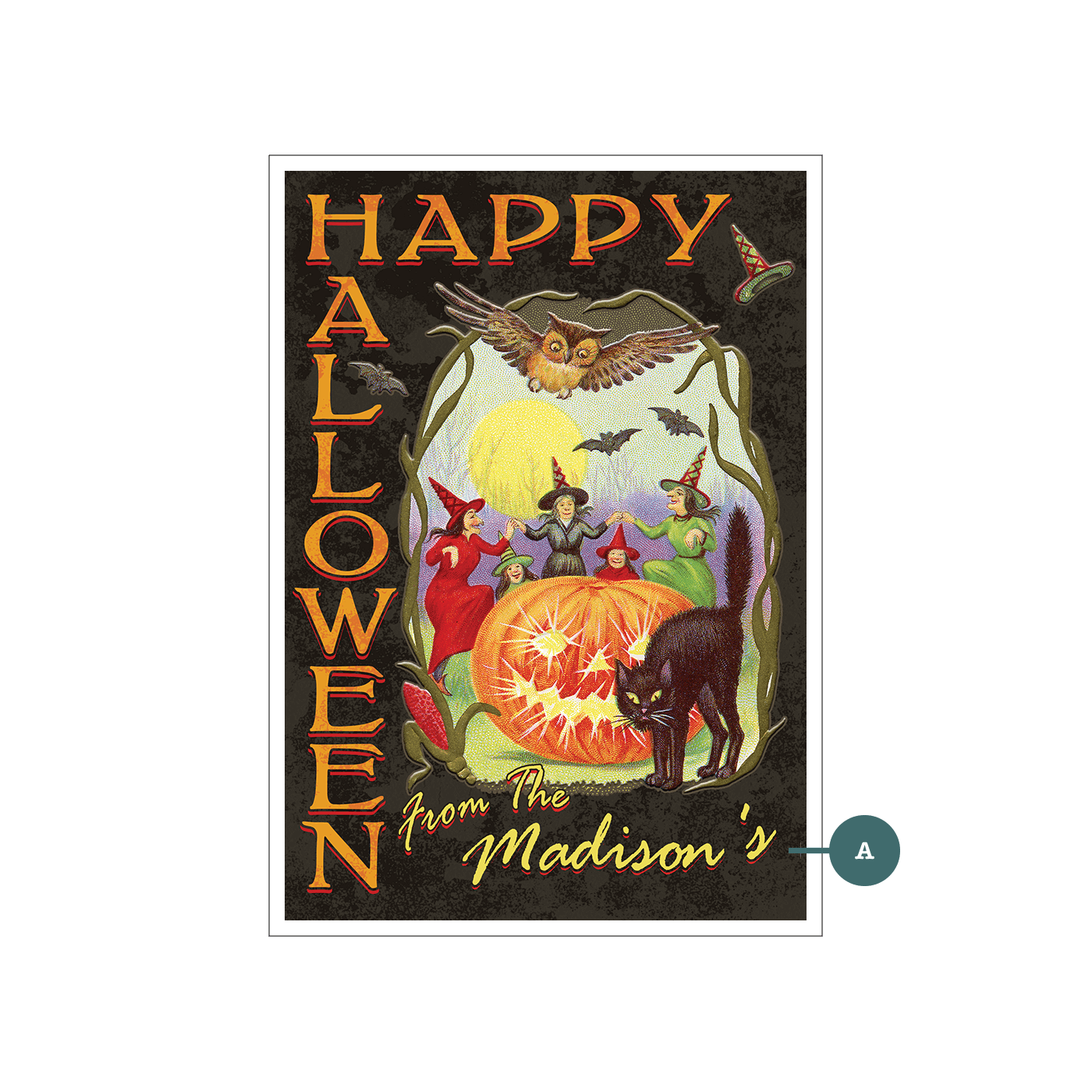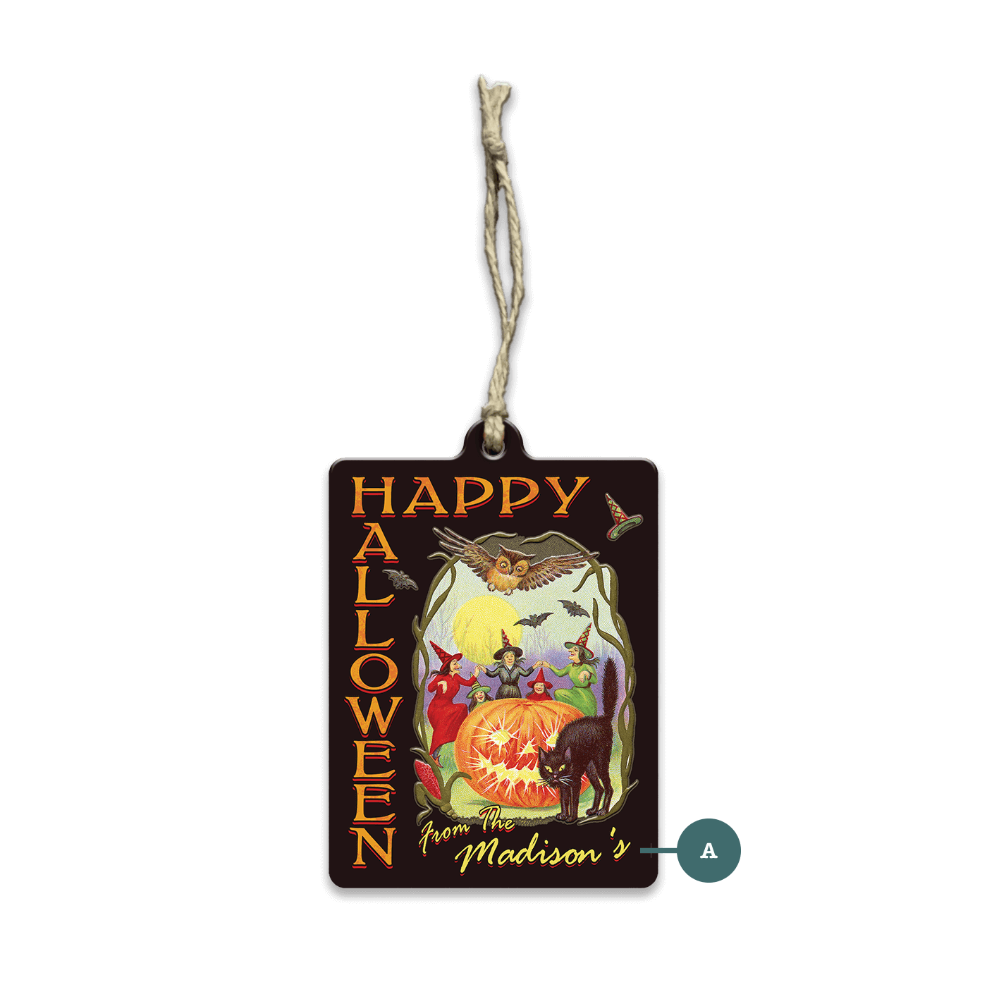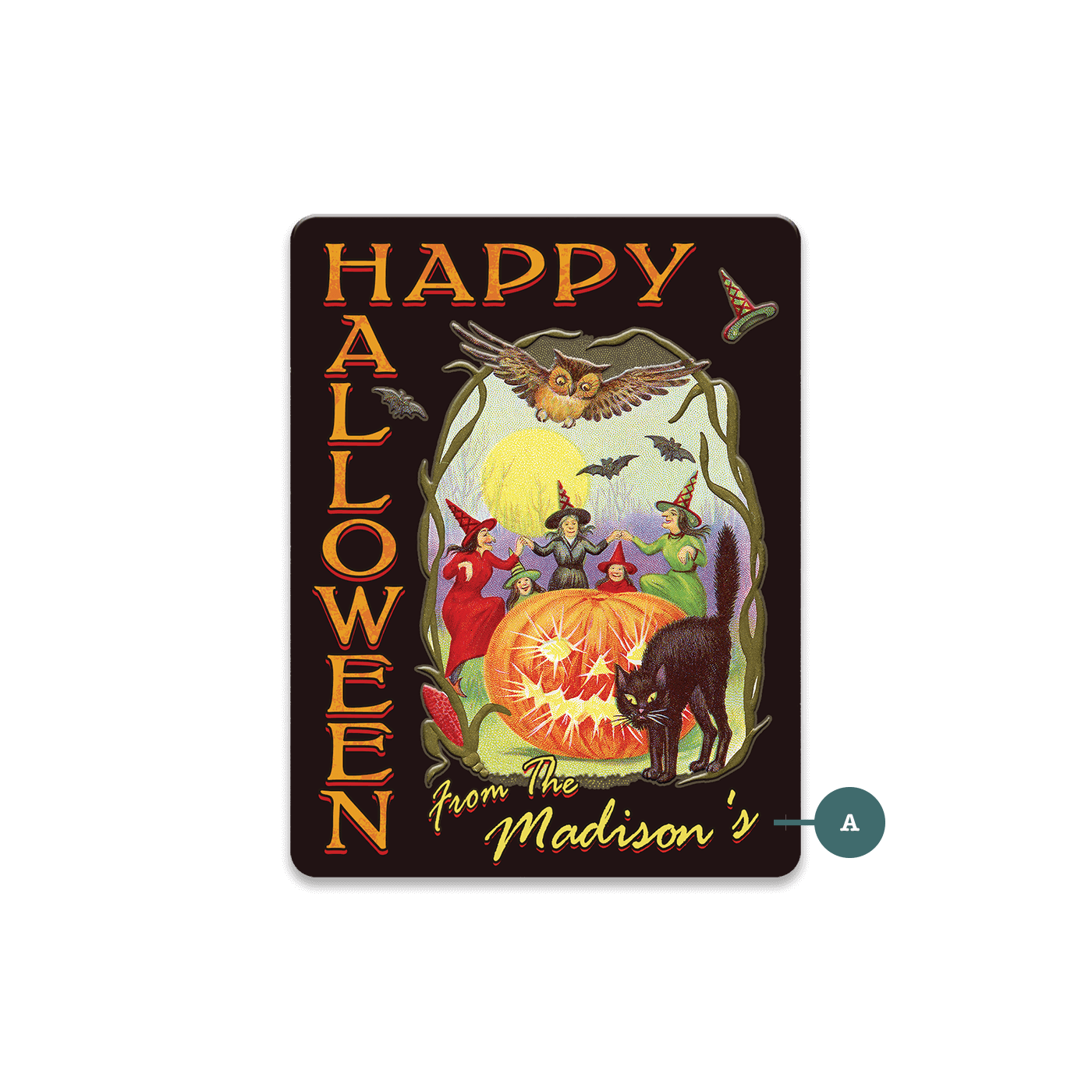 Celebrate the spooky season with this delightfully eerie Halloween sign, where a coven of cheerful witches gathers around a glowing jack-o'-lantern under a full moon. Surrounded by a black cat, flying bats, and a wide-eyed owl, the scene is rich with classic Halloween motifs and vintage charm. The warm colors, whimsical details, and bold typography evoke the nostalgia of early 20th-century postcards—making it a festive and eye-catching addition to entryways, party spaces, or seasonal decor collections. Perfect for those who revel in the playful magic of Halloween.